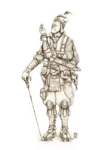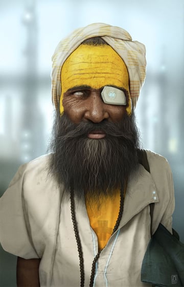 I started with the idea of combining a kind of world feel image, something maybe seen in a times or national geographic magazine, with elements of sci-fi. It’s a concept of showing what the Sadhu, the holy men of India, may look like in the future. Things like his eye piece and glowing shirt are so common in the future that they span across every region of our planet. So having them is as natural as a pair of glasses. I started of with a good deal of research, building up a small reference library. Sketched it out, scanned it in and started painting in Photoshop.