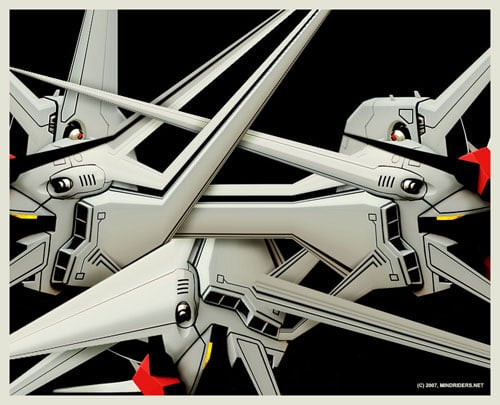 A robotic sci-fi style vexel image. When viewed at full size, this image demonstrates the differences between vector and vexel images well, as you can see the pixels on diagonal lines.
