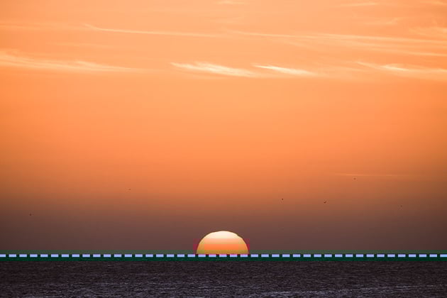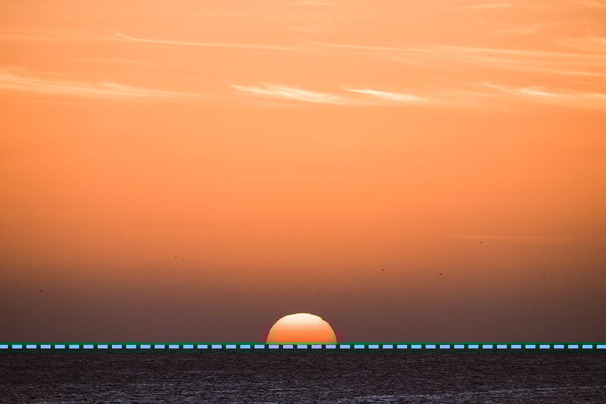 In this photograph, the horizon line is low, and this is used to emphasize elements like a dramatic sky or the sunset. On the other hand, a high horizon line means that the main focus is the foreground.