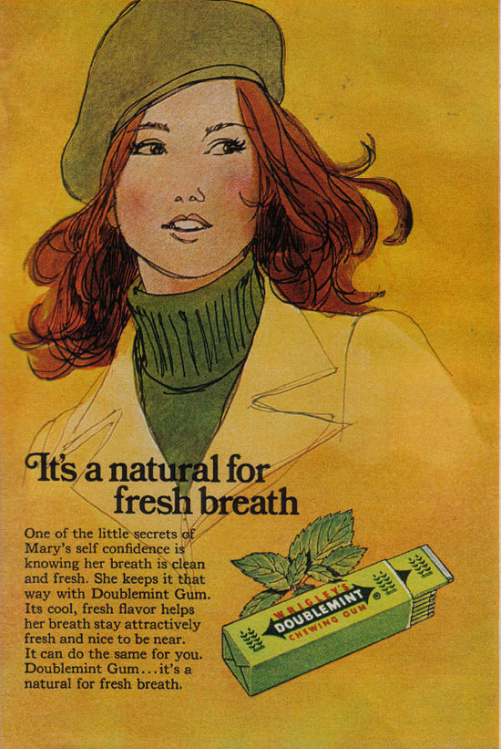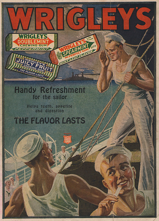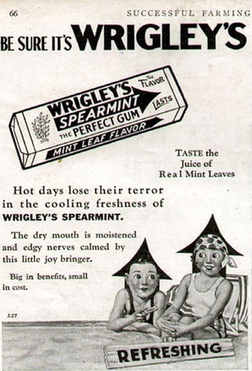Over the years Wrigley's turned to using fashion to advertise their products, as can be seen in the poster below. Using advertising techniques such as this can help to attract customers who you otherwise may have not been appealed to your products. A modern example of this is advertising soft drink brands such as Coca-Cola and Pepsi and targeting them at soccer fans.
