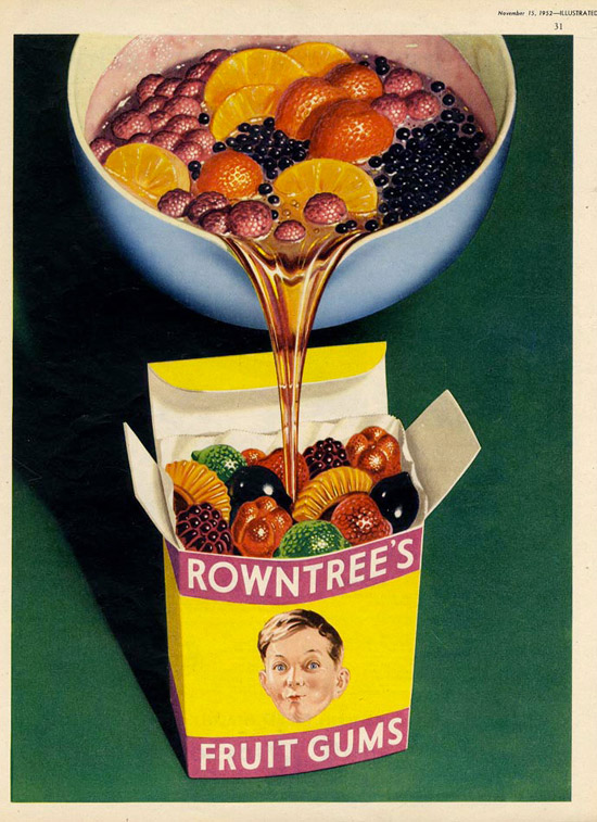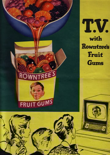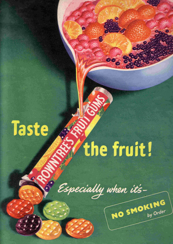 Rowntree's main technique used to help advertise their Fruit Gums is purely color. Their products are bright and colorful and therefore using bright colors such as yellow and green go perfectly well with the product being advertised, not to mention how eye-catching they are... You'd spot one of their bright yellow posters from miles away!