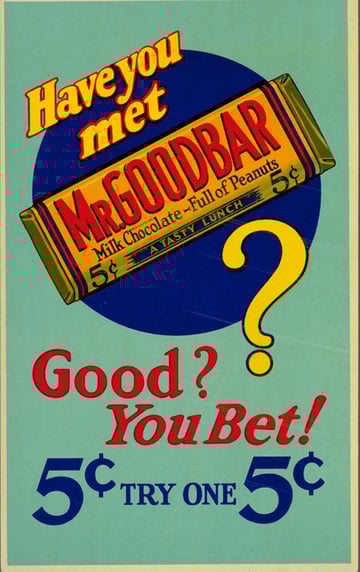 A colorful and very powerful advertisement poster for Hershey's "Mr. Goodbar", a chocolate bar full of peanuts. The simple typography, minimal colors and simple shape (the circle) make this poster not only pleasing to look at, but also very effective in what it's meant to do.