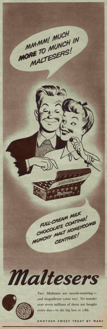 Maltesers have taken a very unique approach to their advertising campaigns over the years. Instead of using standard international or US paper sizes for their ad shapes, they've gone with very thin and long ads. This could of course cause problems as to where the ads can be placed, but this is definitely overcome by how unique and effective they are. These advertisements were both actually used in printed publications such as newspapers and magazines, hint the lack of color.