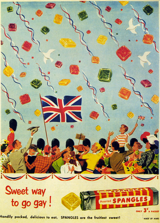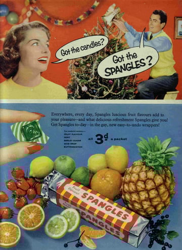 Spangles, like Rowntree's Fruit Gums, use colorful 'fruity' colors in their advertising to match their products colors. As their sweets are fruit-flavored, fruit is also quite often present in their posters. This not only brightens the whole advertisement up but also informs the reader the sweets are fruit-flavored without actually reading any of the print.