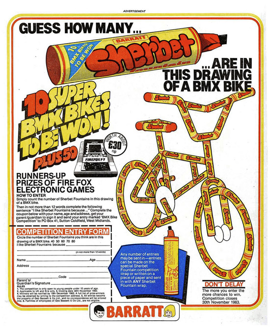 Notice the shadows used on the "10 Super BMX Bikes To Be Won" type in the following advertisement; this is a trend that is used endlessly in the modern day, so much so that you can even get typefaces with the shadow already applied so there is no need to create it yourself! A couple of (free) typefaces that do this are SF Slapstick Comic Shaded and Dancing Donuts, although there are plenty of others out there!