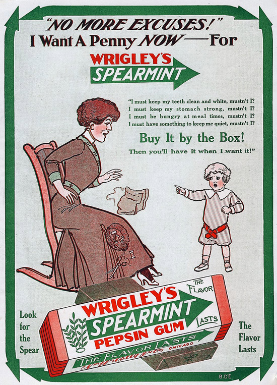 This poster in particular is one we most probably wouldn't see these days; a young boy shouting at his mother for a penny so he can buy a packet of gum. There are of course benefits of such in-your-face advertisements - they're fun, get the viewers attention and ultimately stick in your head.