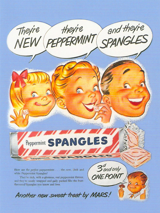 Spangles also released peppermint sweets - in the poster below you'll notice how the same bright colors used in their Spangles fruit ads aren't used; instead a soft minty blue has been used to represent mint.