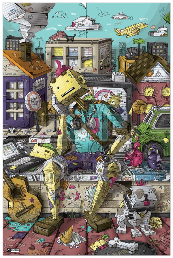 He started created portraits of celebrities, then slowly began to introduce modified elements, and then brought on the scenes they inspired. His more recent illustrations are now without celebrities and involve solely his twisted and elaborate creations.