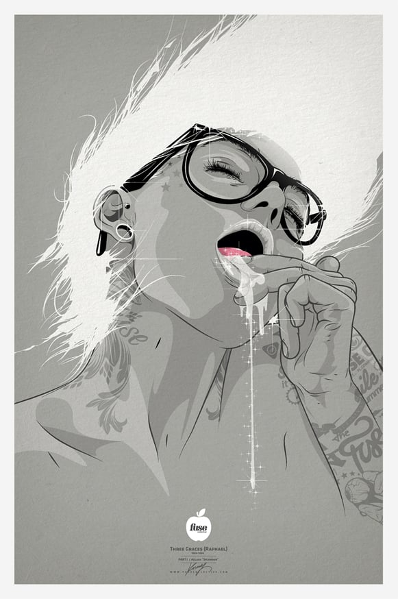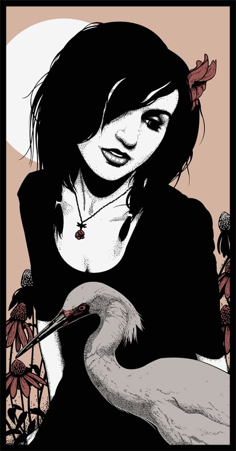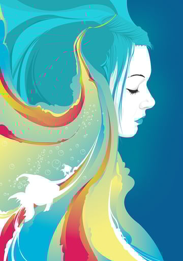 Mixing flowing shapes, marine colors, the odd fish and bubbles with an aquatic themed hair is an interesting direction in this vector portrait. I love the use of gradients within the one central flowing section of the hair. Very well balanced in this abstract style.