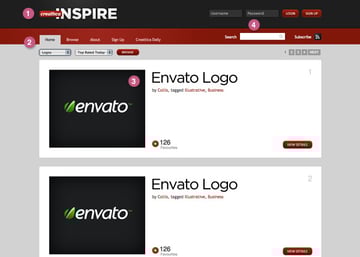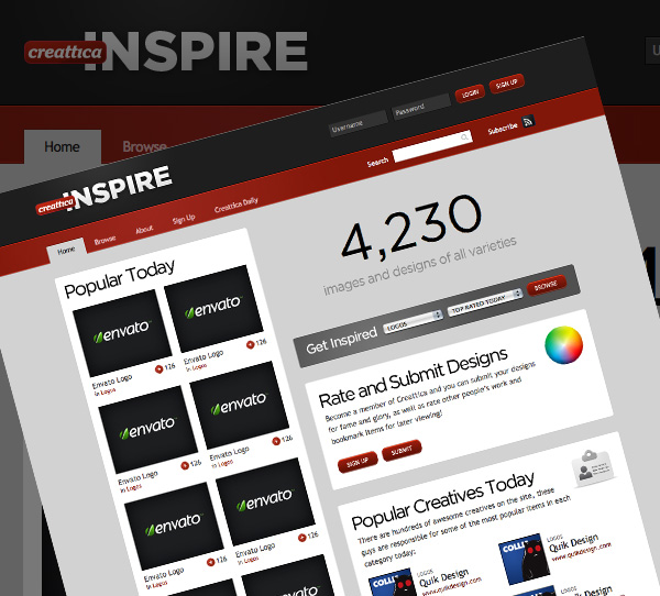 When we launched the first Creattica subsite a couple months ago - Creattica Daily - I foolishly didn't plan ahead. Instead I just designed a neat blog design and launched the site without thinking about what I'd do for the other sites. Well as you can tell from this Creattica Inspire look, I've had to start from scratch again. The old look is now up for sale on ThemeForest as a WordPress theme so it's not a total waste, but nonetheless it really pays to think ahead and design a look that suits multiple sites.
