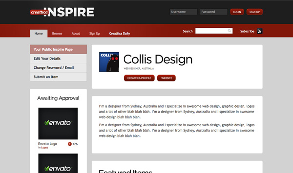 So we're pretty much rebuilding the system from scratch and importing all the old content. The new site will sit at inspire.creattica.com and will be part of the suite of creative sites and services that we're building at Creattica.com. So some weeks ago I set about redesigning FaveUp and at the same designing a look for Creattica. The end result are these mockups that I'm going to be discussing: