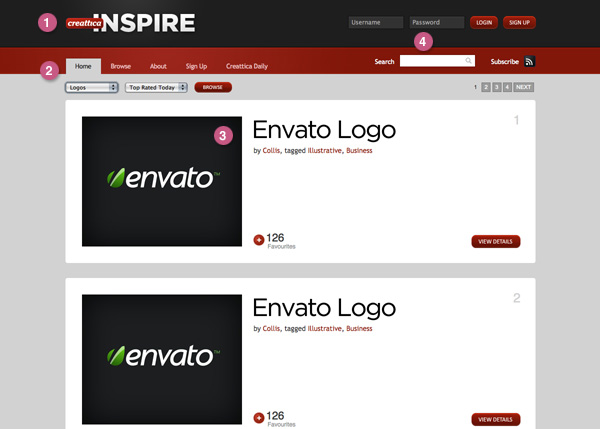 In this post I'm going to show you a set of twenty screen mockups for a real world project that I've been working on - the upcoming redesign and rerelease of our design and inspiration gallery FaveUp. I'll explain some of the why's and how's that went into the design, how I use design mocks to spec out a web app, as well as some general notes on the design. The new site that we're calling Creattica Inspire is now being developed by our crack Melbourne development team and will be hitting the interweb tubes as one of our first releases of 2009.