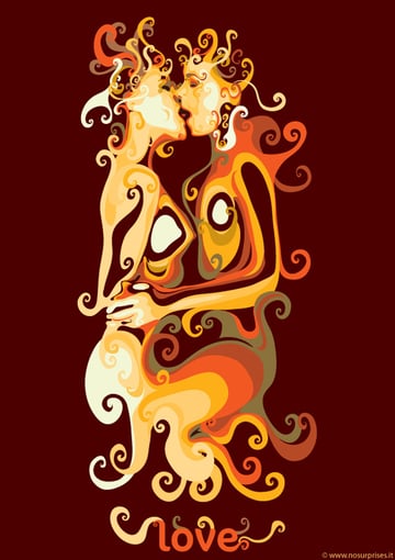 Thoughts of the poet about love. What else can you think of on Valentine's day? The artwork is done in warm colors; cute characters cause a smile. The sun's rays and the background texture add warmth to the image.
