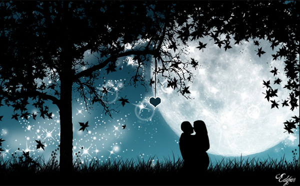 The night is the time of lovers. Artwork uses a wonderful composition making use of bright moon against a dark foreground.