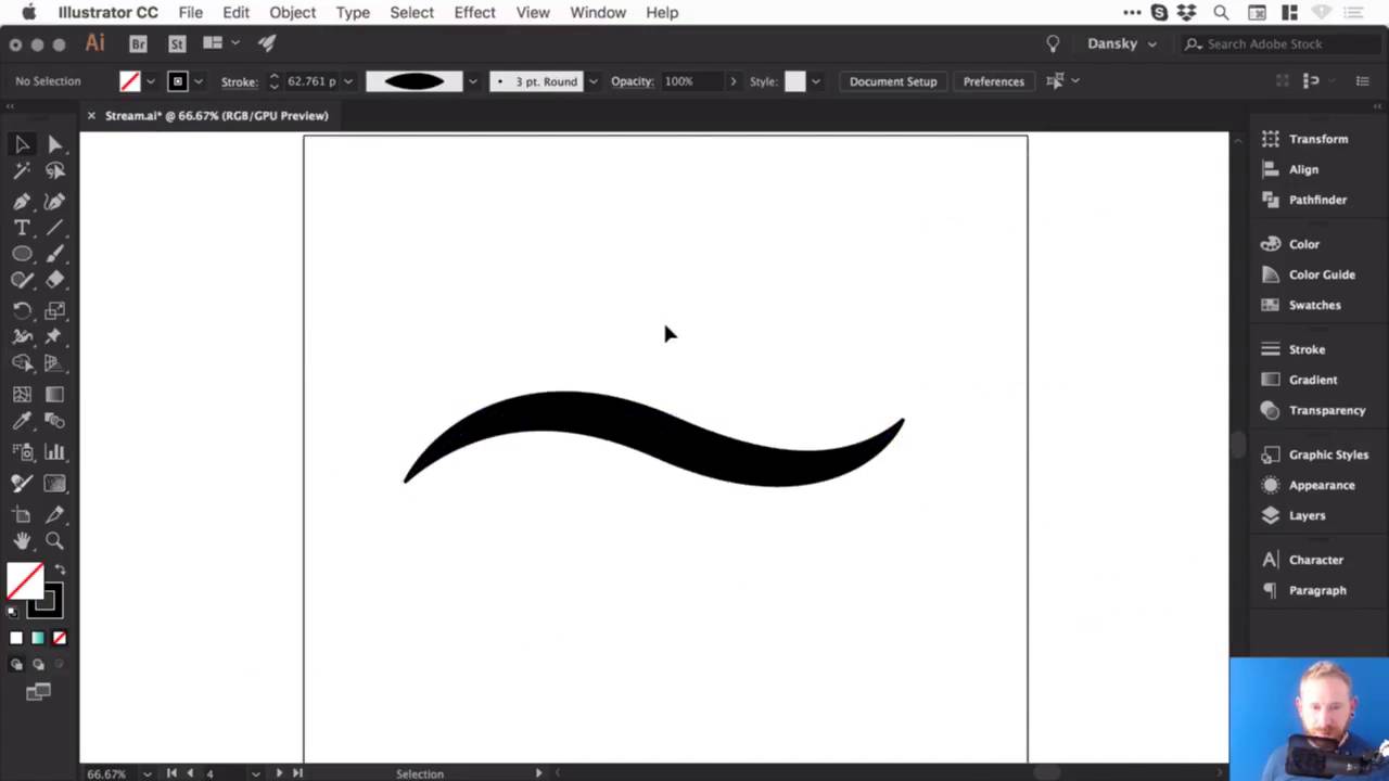 [MUSIC] Righty-o, number four, I absolutely love this tool. So, if you've never used the width tool before in Illustrator, prepare to have your mind blown. This is amazing, and I love this one so much. So I'm gonna grab the pencil and just remove that fill, and we've got a black stroke. And I can left-click and left-click again, and we'll just drag. And we're just gonna draw a nice, wavy line. And it wants to continue this line, we can just go up to Select and down to Deselect, or just press Esc on the keyboard. And from the stroke panel on the right, we can increase the weight. And yeah, I mean it's a line, it looks okay, but we can also use the width tool to adjust the width of the line at different points. So you can see this over here on the left, and I believe you will need a copy of Illustrator CC to have access to the width tool. So let's click this, and I can now hover along this path and you can see it has a plus symbol. So I can click anywhere along this path and drag up or down. And from that exact point, it will become a bit thinner, Or a bit wider, or what we can do is we can grab the existing anchor point. So at the moment, this shape is made of up three anchor points. We've got one anchor point at either end, and one in the middle. So if I hover over this and click, I can, of course, do the same thing. So we could bring these anchor points at the end in, so they become smaller. And once you've created an adjustment point, as well, you'll see you get these two points either end. Just grab either of those and bring it in. And then we can hover over that middle anchor point, let's just zoom in on there. And we can then make this wider. So you can see we've adjusted this middle anchor point, so when we hover over it again, we get this line here that runs across the width of the stroke, and we can adjust it from there. And we've still got square kind of edges on the end, so if we just drag over everything and then round off the cap, you get a lovely round finish as well. So this is a great way, if you're kind of creating illustration or some floral decorations or really creative borders. You can draw a lot of your lines just as normal strokes, and then you can go in and really refine the width. For example, this would make a fantastic eyebrow if you were doing the illustration of someone's face, for example. Or we could just hold Alt and drag, and we'll scale this down. Maybe move this up here. And then, of course, still go in and adjust the stroke weight. Now if you've applied some changes with the width tool, and then you go in and you adjust the stroke weight, it will still remember all of the different proportions. So even though we're adjusting the stroke weight now, we're bringing it down, making the stroke thinner. It's still going to remember that the middle is a little bit wider than either end. So we can bring this one down as well, and do something like this. And bring this one down, and we can even go a little bit wild, as well, if we grab that width tool, and we can just select all manner of different points. And you can, Really get quite creative with this, actually. [LAUGH] I'm not entirely sure where this is going, I have no idea what this is. It looks very abstract, but you can see that you can fully adjust the width of any stroke at various points along that line. Fantastic, so that is the width tool, I absolutely love that one. And when I first learned that, I was honestly blown away, because it's a tool tucked over here that I hadn't actually ever used before.