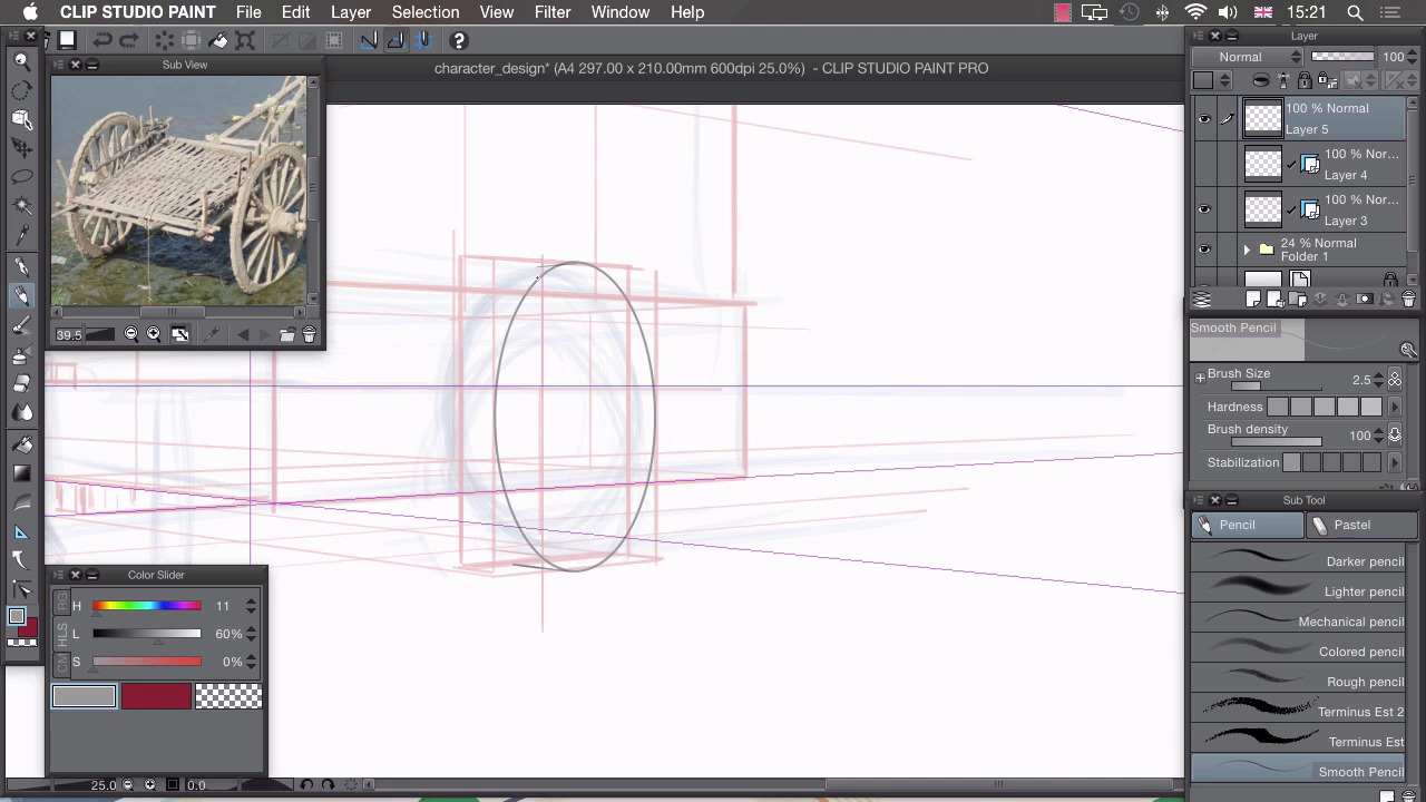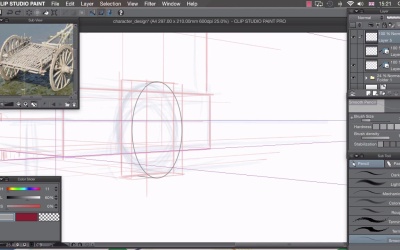 Hi. Welcome back. In this lesson, I'm gonna show you how to use our very rough sketch layers to create the background element of our illustration. Now that we have our rough idea of what we want to draw. And we have our prospective guides in place here. It's time to start drawing things properly. And I'm gonna start by drawing this push cart at the back here. By drawing something that's 3D, it becomes a lot easier later on to create volume with this character, and to place him correctly so that he's grounded at the floor. Its also a lot easier to start from the background and work your way forward to the foreground. The first thing I want to do, is change my reference image. So if scroll along by clicking on this button here to the picture of the push cart. And I'm going to zoom in on that, so I can see a few of those details. And center it like that. I also need to change our layers. I need to change this, so that we can still use this perspective grid here, and not always see this perspective drawing that we've done, cuz it might interfere with what we're drawing and we might just want to use the ruler on it's own. So if I create a new layer and drag that to the very top like this, we can actually split this ruler away from our drawing by clicking on it and dragging it to this new layer. I also need to create a new folder for our rough sketches. So if you click the third icon at the bottom here, that creates a new folder. We can just drag these new layers in, like that, and collapse it, so that it's nice and neat. By doing that, we can also change the opacity of both letters at the same time. So these are a bit too dark at the moment and would interfere with the new sketch we're gonna draw. So if you just drag the opacity at the top down to around 20% we can still see all of our base sketching but it won't interfere so much with the drawing we're about to do. Now, moving on to this layer at the top which now contains our prospective ruler. I'm not actually going to draw in this layer, because I'm gonna use this as a container for our ruler that we can turn off and on. So if I create another layer on top of that, you can see, I've also changed my ruler by clicking on the side of the top here to show in all layers. By default, the layers are set to show only when editing the target. So if I go to this top layer, I've changed it to its default. Go to the top layer and our ruler disappears. We need to change that to, Show in all layers, and we can then use this ruler in every single layer that we have. The first thing I want to tackle on this push cart, I think, is this wheel at the bottom here, and that's gonna need another ruler. So you can see why we've set up multiple layers here, so we can turn off and on multiple rulers, because to turn off snapping on a ruler, we would have to click on this icon at the top here, but that turns of snapping to all rollers. So if we just turn off each layer. So I'll just show you. At the moment, we have snapping set to perspective, but if I turn off the visibility of that perspective layer, I can then draw in freehand all to another ruler which I have contained inside another layer. So getting back to this wheel here, we're gonna need to draw an ellipse. So if we click on our ruler icon here, we want a special ruler, and we want concentric circle. I'm gonna drag out a circle onto the canvas like that, and that creates a circular ruler. Choosing the operation tool or by pressing o on your keyboard you can manipulate this. So I'll rotate that to make sure that these verticals line up like that. And I'm gonna try and move it so that it's in the center of this front face of my rough wheel shape. You can then. Change the shape of this ellipse by dragging these cubes. And I want this ellipse to only just touch the very edges of this outer face, and work on the vertical as well, needs to move down a little. So about there. So you can see, I've managed to manipulate the ellipse so that it only touches on the very edges of our box. We need to change this ruler so that it works on every layer as well. So again click on the icon at the top, showing all layers, and create new layer. Go to our pencil. And we can draw an ellipse like that. I'll show you now how this multiple ruler setup works. So at the moment, we're snapping to this ellipse here. If we were to operate our ruler by turning it off and on with this button here, that would turn off all rulers. But what we can do is turn off our ellipse and turn our perspective back on. And then, you'll see that instantly we have snapping in perspective, and that will help us figure out the other ellipse, like that. So we can turn off perspective again, turn on our ellipse, go back to our operation tool, and we can move that so it lines up, with this backface here. Back to our pencil, back to our top layer. And we can draw in this line like that. So if I turn off all the rulers, you can see that we've actually got quite a nice wheel shape drawn in. I'll zoom out there so you can see it in context. And I"m basically going to use these two rules turning off and on visibility like this to build up a design for this push cart. I don't have any design at the moment, I just have a big box, which I can then manipulate and draw different parts on and use it as a basis to design it. I've got this as a good reference. I'm not gonna copy it piece by piece. It's not gonna look exactly the same. I'm just gonna copy the sort of very rough ideas that are in this reference image. So, for example, I like the way that, if I zoom in here, I like the way these pieces of wood are interlocking. So I might use this sort of binding mechanism here on the corners of this design. And I might use this sort of woven effect at some point in my design. But this design ultimately won't look anything like this, it will just have sort of elements of realism taken from this and applied to my design. So I'm gonna be drawing in the one [INAUDIBLE] like thi