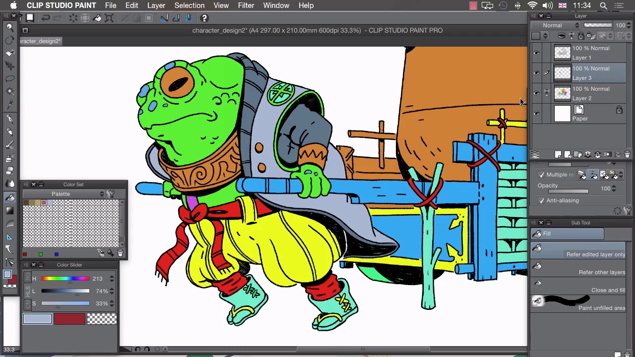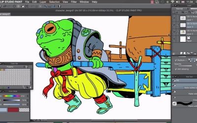 Hi, welcome back. In this lesson, I'll be showing you how to add color to an illustration. With our flats in place and our palettes selected, we can now really easily add our colors to our illustration. I'm gonna just create a new layer here above my flats and this is the layer that my colors will go into. Next I want to choose the paint bucket tool. And I need to make a few changes in the layers here so that we can easily color this in. But first thing to do is go to our inks layer, and turn off the referencing mode. So we don't need to use that as a reference anymore. But we do need to use our flats as a reference, so if we select that layer and click on the small icon at the top to turn that into a reference layer. We can now use these flat colors to dictate the behavior of our paint bucket. So back to our color layer and go to our Tool properties. And what we need to do is have Multiple Referencing ticked on for our paint bucket tool but we need changed that to Reference layer. So that means that these inks won't affect our paint bucket filling but our reference layer only will. So if I choose one of these colors, for example the light blue. Because I have this reference layer. Our flats is our reference layer. I can then fill any color like that with one of my selected colors really, really easily. So I can just go ahead and do that in all sections like this. And you'll see how quick this is. And as easily as that I have the majority of his jacket filled in. I can also use different kinds of layer so if I keep a layer on top of that and for example fill in his skin. So the behavior of our paint bucket tool is still the same, like that fill all of this in. Like this. And in a new layer, I can choose the blue. And at this point I'm gonna change it to darken and choose my pen tool. I can then use the same colors and get a different hue. By choosing a different blend mode. So because I'm in darken I've got this sort of slightly greenish color being created by combining this blue on top of that. I'm gonna apply this technique to the whole image, and once I'm finished it should look something like this. Now because we took the effort to create these flats I've managed to color this in really simply and really quickly. And only using four different layers. So I have two normal layers like this. I have a normal layer with it's opacity set down which changes certain hues here. You can see if I turn that off and on how the hues change. And I have a darken layer. So, I've put a blue color over the top of one of these yellows or greens, and it creates this slightly greener look. So if I turn that off and on You can see that changes the warts on our toad there. The last thing to do would be to merge all of these layers so that we have just the one color layer. So if I select them all by holding Shift, right click on one of them, and we choose Combine Selected Layers. That merges down into the one layer, and we can move onto the next stage, which is adding shadow. In the next lesson, I'll show you how to shade your illustration.