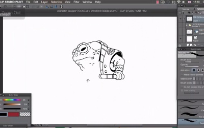 Hi, welcome back. In this lesson I'll be showing you how I go about inking over my drawings. With our pen tool set up, we can start inking over this drawing that we have here. And I'm going to show you how I do that by showing you first on a small piece and explaining what my thought process is behind that. I'm then gonna speed up this recording and you can watch me go through the whole piece much quicker. So, the first thing I do is zoom right into my drawing. That way, I've got maximum control. And I can make sure that my line width is how I like it at all times. So I'll focus on this arm piece here. And what I do is just ink over in a separate layer on the top here, like that. And we're trying to duplicate the lines that we have with our pencils here. I don't like varying my line width too much. I like to keep quite an even line width here. And I'm doing this completely freehand so. I'm just drawing in lines and if I don't like them I can just undo them. Drawing in lines like that and doing that free-hand, cuz I like this slight wobble that you get when you do things free-hand. So this wouldn't have quite as much charm for me if I'd have put a ruler tool to make this ellipse here like that. You may notice what I'm also doing is adding a little bit of embellishment to my drawing, so if I turn off the inks for just a second, you'll see that this sleeve piece here didn't have sort of a double edged thickness to it, but in my inks, I've added this extra line here, and that gives us this sort of thickness here in the sleeve. So throughout the whole drawing, I'm gonna go through and sort of embellish on the drawing that I've done, cuz this is only just a rough basis. I like to sort of keep things a bit fresh and keep things a little bit spontaneous when I'm inking as well, so if I move onto this pattern on his shoulder here, you'll see that again I'll draw the rough shape like that and fix any mistakes. And at this point, I'm gonna start just ad-libbing the design on our character's shoulder, so I'm going to make some quarters in this design here. Like that. So you can the difference between our sketch which is really quite loose. And then the ink over the top. I've gone and changed that and I've added some thickness to our lines. And I'm going to be adding a few sort of decorative patterns that he may have on his clothing, and then onto this inner sleeve here like this. Gonna draw pretty much what we have. Like that. Another thing I like to do is fill in black areas as I go along. So you may like to fill in the black areas once you've done all of your outlines, and that's perfectly fine. But I like to sort of be able to gauge how much black I'm using in my piece, so I do it as I go along. And I'll know where to add to keep balance. So in areas where I'm not gonna be using shading I want things to be completely black, so if they're completely obscured from light I usually fill them in completely black. So I don't think a shadow would fill in this space for the sleeve adequately, so I'm gonna go in and just completely ink that in like this by just roughly scribbling in here. And I like to keep these very small pieces here so it looks a bit more like you're using traditional media when you zoom out. And I'll add a shadow over this arm here. So this gives us a really heavy shadow on his arm, and implies that his arm is going really deeply into this sleeve. Few wrinkles on the shirt underneath, and a little bit of shadow again. And another thing we need to do the whole time is keep zooming out. So we need to zoom out and turn off our drawings, and just see what's happening with our inks alone. So it's always good to just compare with our drawing and see what's happening, see that the marks we're making are nice and see how we're progressing. I'm going to continue doing this throughout the whole drawing and I'm going to speed this up so you can follow along. Once we've inked our whole drawing, we just want to turn the ink layer off and on. And that's just to check that we haven't missed any details that we have in our sketch that we haven't actually inked in. So we'll just go off and on with the ink layer like this just to make sure I've not missed anything. And I'm pretty sure that I've inked everything there. So I hope you're able to see how I just used a few basic principles to ink this whole drawing. Just to recap, what I basically did was trace over any lines that I do like and lines that I don't like or lines that are only there to imply volume that I'm going to use for my shading stage. I haven't inked at all. I've added extra details so I'll turn this ink off. Added extra detail when there wasn't any in my drawing, and I filled in black areas to add clarity or to push objects further into the background. In the next lesson, I'll show you how to flat your new ink drawing ready for coloring.