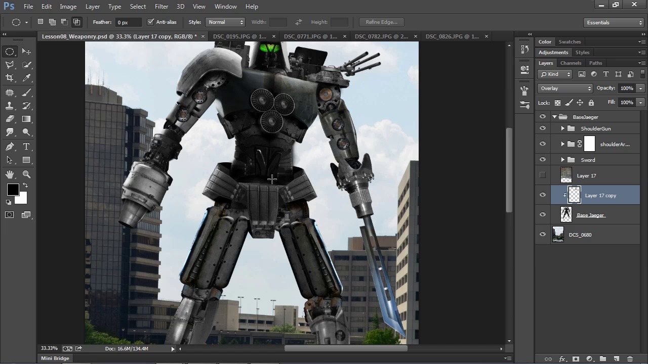 In this lesson, we'll use the source photos of scratches, rust, and grunge to create custom brushes, then use those brushes to add battle damage effects to the robot.
