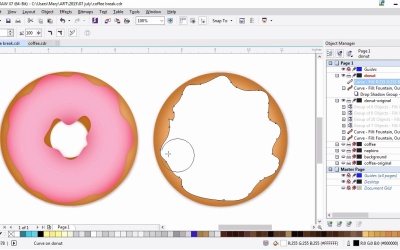 Welcome back to advanced techniques in curl draw. I'm Mary Winkler for tuts+. In this lesson we'll draw some delicious drippy frosting playing the various drawing and manipulation tools. Let's continue where we left off in the previous lesson creating a delicious donut. I'm going to unhide my original drippy frosting in the object manager so you have a good idea of what we're creating. Over in the Toolbox, we're going to use the Freehand tool for this one. Even if you're using a mouse to draw, we could adjust the settings so it's more forgiving and renders smooth lines compared to jagged ones. Double-click the Freehand tool, and you'll come up with the Toolbox Options. In the menu, select Freehand Bezier Tool to adjust the settings. I've set my corner threshold to five pixels, straight-line threshold to five pixels, and auto join to one pixel. You may want to lower the threshold of some of these setting if you're using a mouse versus a graphic tablet, but that will definitely be your choice. Using the freehand tool start to draw a wriggly scalp shape around the inside of the donut. How drippy or scalped it is is entirely up to you. You can use the shape I created in the left as a guide. Watch and follow along with the donut on the right or create your own unique shape. Once done, use the zoom tool to zoom in and make sure those beginning and ending nodes have joined. If they haven't you can easily do so with the pen tool. Select the origin known and the ending node with it and you'll find that your curve is no longer open. In the case of my shape the nodes need some adjustment. Select the node you don't want with the shape tool and hit delete node in the property bar. Now, my wiggly, curvy shape is mostly circle like versus cutting inward toward the middle, which is something that I want. This isn't quite the shape I wanted for my frosting object, it's not nearly drippy enough and some portions are just a bit too angular. We're going to manipulate the curve's path. Grab the smooth tool found in the shape tool fly out and drag it around the edge of your frosting. Now my smooth tool is set to one inch to the sides and 100 for the smoothing. Adjust this as you see fit. Wait what about drippier frosting. Grab the smear tool. Also, within the shape tool fly out and manipulate your frosting contour. Do it too much and it will be smeared wildly. Too little and there won't be much of a change. Interactive tools like this are all about creating organic objects. Get messy with vector. Set this mood tool to smooth smear and get some more bumps and rigid and scallops and contour, then switch back to the smooth tool to even out your frosting. Using these tools in conjunction with each other really helps create fantastically delicious donut frosting for our illustration. Whenever you're satisfied with your frosting shape's contour, you can move on to the next part of this lesson, which is to cut a hole in the frosting. Much like the donut, we'll use the shaping docker to accomplish this. For now, I'm setting the fill to none so I can better see the donut hole, and get an idea of what I want my cutout shape to be. Using the freehand tool, draw a smaller shape similar to your current frosting object. You want to show some of the donut beneath as well to make it look like the frosting is dropping into the center of the donut. Zoom in, and make sure you like the way your curve joined together. Using the shape tool, delete, add or reposition nodes in your handles so smoothing or smearing the curve will be easier. Use the smooth tool and the smear tool to manipulate the object to get it just the way you want it. I'm going to set my fill color back to something solid, so when I hit either simplify or back my instrument, this change will be easily seen. Select both objects and apply your shaping effect in the shaping docker. I hit simplify and then deleted the unnecessary object. From here you can decide whether or not you like your frosting shape enough to move on to rendering it or refining it further. I want to add some bits onto my frosting shape. Using the free hand tool, I'll draw these additional shapes as complete objects over my current frosting. Make sure all additional shapes have closed curves, and position them so they're overlapping the portions of the frosting you want to weld them to. If you hit Weld without making sure the newly drawn shape is closed you'll only end up with the portion of the shape connected in the way you wanted. Always make sure your curves are closed and nodes are joined when you want them to be complete shapes. Alternatively you can also play again with the smear and smoothing tools, how to create organic shapes is up to you. I like to work quickly and freely with tools that let me create unpredictable curves as though I was really frosting a donut, or letting icing melt and move over an organic surface. When you're satisfied with your icing design, you can move on to the next lesson. Thank you so much for joining me in this lesson on drawing unpredictable organic shapes. In our next lesson we'll work on rendering the frosting and explore some quick techniques for working with and choosing color.