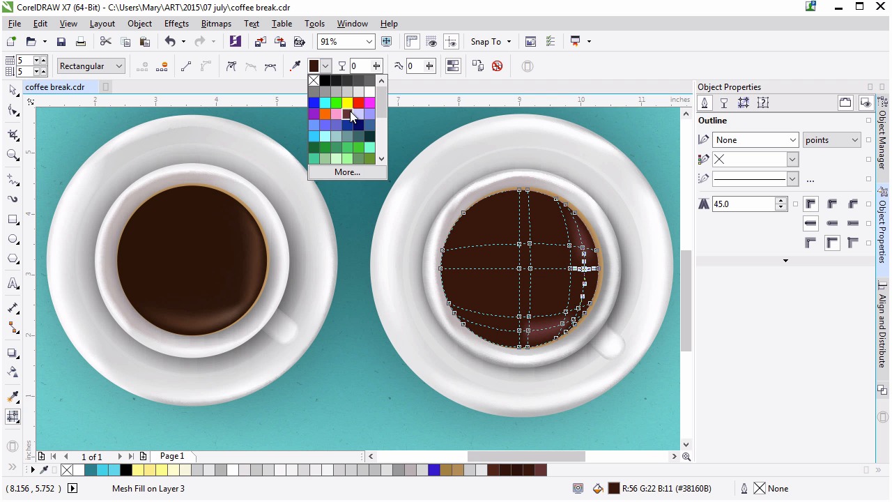 Welcome back to Advanced Techniques in Corel Draw. I'm Mary Winkler for tuts+. In this lesson we'll continue filling up our coffee cups with circles and mesh shapes. It's amazing how simple shapes can transform an image into a completed illustration. Let's get to it. Unhide your coffee components in the object manager. As you can see I have a fair few objects to show against so we can get going on this lesson. Make sure you don't mess up the order of your objects. It should go, saucer components, handle, cup, and cup contents. Group together components, unlike objects, with Control G, in order to keep your object manager organized. We created some cup contents in the previous lesson, but now we want to continue working on filling up the mug with freshly brewed dark coffee. I'll unhide my original mesh object to show you what we'll be creating, with some additions in this lesson. Draw a circle with the ellipse tool as we've done so many times at this point. It should be nearly as large as the light brown circle below it. You can scale it and reposition your circle with the pick tool. You want a small sliver of the tan circle to be showing beneath the top circle around the outer edge of the right side of the newly drawn circle. It may take a small bit of trial and error to place the circle correctly. You can, of course, always readjust your object placement to where you want it to be within your illustration. Once you like the placement of your circle, head on over to the object properties docker, our old and faithful friend and eliminate that pesky outline if it's showing up for you. I keep mine as a default so you can easily see the placement of the boundaries of nearly drawn objects. Select the fill color to a rich, dark brown. We're going to go darker than this in the mesh, but I like this as a fresh starting point. Here's my original mesh, it's fairly simple. There's a half circle of nodes on the right side that have a lighter brown applied to each. We're going to add some additional nodes to ours, but this is the basis of the coffee design, much easier than the cup and saucer for sure. Using the mesh tool double click on the bottom right side and lower right corner of the mesh to add three nodes to the design. As usual, additional nodes pop up in each new cross section within the mesh. Select five of the lower right mesh nodes, not those on the outer edge, we're only working on the inside of the mesh in this lesson. Now apply a light brown to them. You can check out the default color palate, or hit more to bring up the color picker. Initially, I chose a lighter brown that had a reddish tone. This isn't the tone I want for this illustration however. I want my browns to be on the tan side, rather than reddish. It's an easy fix. If you choose a brown you didn't like, select your notes again and bring up the color picker from the property bar. Slide the bar upward from red to orange. The tone of the bottom of the rectangles and the upper right is the new one you're choosing. Check out your new color, or try out a couple of other hues in order to get it just right. Deselect your mesh in order to see it clearly when deciding on the colors used within it. Make sure to highlight colors, the light browns, for more of a half circle within the mesh object and connect in the lower right corner. You can use the eyedropper in the property bar to add a color to a node that's already within your document. Select the node in question, select the eye dropper, and then select the node whose color you want to copy. Select some of the edge nodes on the left side of the object and apply much darker brown to them than the one currently in use. I want the rich, dark coffee we're creating to be more dramatic than the example on the left. Adjust the nodes of the coffee body next to the highlight nodes by moving them closer towards the outer edge. I'm doing this in order to create a thinner highlight. Select the upper and central nodes, and use the eye dropper from the property bar once again in order to apply the dark brown chosen earlier. Be careful to not miss nodes when selecting groups of them, and always hold down shift if you're trying to select more than one node. Select the pick tool from the toolbox to quickly deselect the mesh and admire your handy work. Look how dark and full bodied this cup of coffee looks compared to my first example. You can of course go with a lighter brew if you wish. Look at the mesh of the original piece and the mesh newly created. You can see that while they look quite different, as a completed illustration, their meshes are quite a bit alike. Color choice can make or break a rendered design. Adjust your mesh as you see fit and make sure to continue saving your work often. Thank you so much for joining me in this lesson on creating a coffee portion of our coffee cup. In the next lesson, we'll finish it off with some quick techniques to make your coffee shine and look a bit more realistic still.