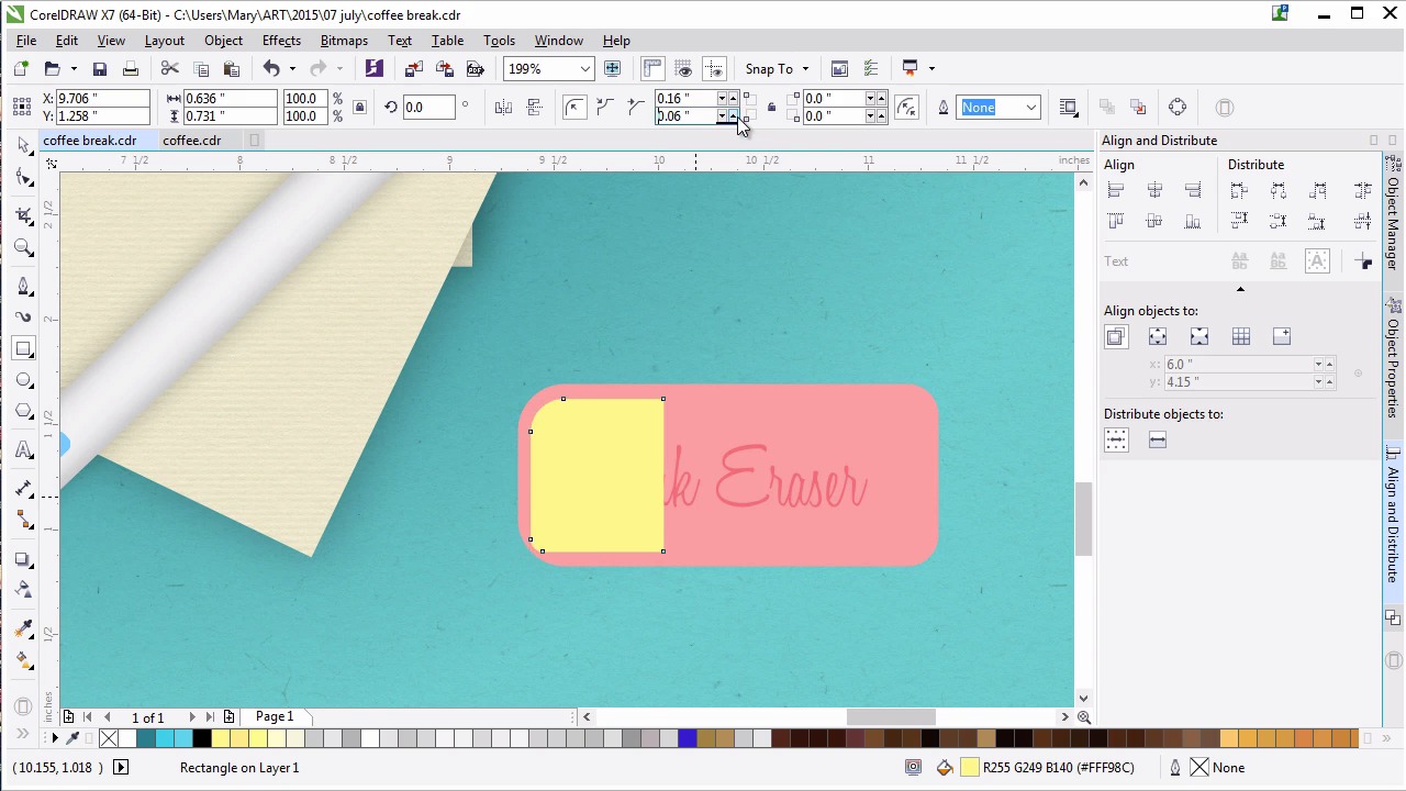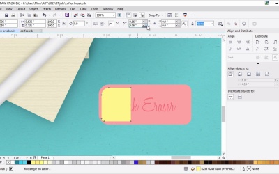 Welcome back to Advanced Techniques in CorelDRAW. I'm Mary Winkler for Tuts+. In this lesson, we'll continue working on our assortment of office supplies with a pink rubber eraser, and some custom text. I've zoomed into my illustration in order to work on the eraser. It will hang out near the pen within our composition. Use the rectangle tool to draw a rectangle, mine is about half the length or a bit less than the pen. You can make your eraser whatever size you want, but the rectangle should be pretty close to the final size you've intended for your eraser to be. In object properties, choose your erasers shade of pink. Go for something reddish or a bit pinker to match the donut. Really this is up to you. Grab the pick tool and select your eraser. Filet the left corners together and then the right corners. My left corner radii will be 0.24 inches. Since my rectangle is two inches in width, this rounds them out a bit. My right corner radii will be 0.16 inches. You can play around with the radius of each corner as you see fit. Grab the text tools in the tool box and either click an area within the eraser shape or draw a small box with it to define your text boundaries. Write a couple words for your eraser brand or style. I'm making mine very, very simple. Pink Eraser. This is a good place to write down your own name, brand or some little message to viewers of your work. Or you can write down the brand of an eraser that you use often. Change the size of the text and other object properties or the property bar. I don't want you to take up all of the space with the eraser. But I do want it to be legible within my illustration. Change the font to some sort of refined script. I like Honey Script for this design. Make sure the size of your text didn't change too much. Enlarge it if you have to. A lot of this is simple trial and error. I've settled on Honey Script at 26 points in size. With the text tool selected, change the uniform fill in the object properties docker to hot pink. Convert your text object to curves. Under transparency, set the blending mode to multiply and the transparency to 56 or so. Scale your text shapes up and in the align and distribute docker align your text group to the center of your eraser. Draw a small rectangle on the left side of the eraser. Fillet the left corner so the mimic the erasers own corners. Scale the rectangle like so, so that it's closer to the edges of the left half of the eraser. Set the fill color to dark pink, I sampled the text color with the eye dropper. Use the transparency tool to create a foutain fill transparency going from left to right. Adjust your fountain fill, so that the black box on the right doesn't extend past the shape's boundaries. Like we did while rendering the coffee and the coffee cup, we do this with a transparency gradient effect fades into the shape it's overlapping. Versus showing the actual boundaries of the object that has the attribute applied to it. Duplicate the pink shadow shape and rotate it 180 degrees, so it can easily be placed on the right side of the eraser. Change the radii of the corners to match the erasers right corners. Set the fill color to a lighter pink, and under transparency, set the blending mode to screen. This forms a simple bright highlight on our eraser. Since rubber is a pretty simple construct, it doesn't have a lot to render. I've found this to be a nice compromise between rendering too little or too much. Group together your eraser components and use the drop shadow tool to add a drop shadow to the group. Set feathering to 6. The shadow color to a deep, dark pink and the transparency to the mid 30s. Zoom out with the zoom tool and rotate and move your eraser with the pick tool to situate it within the composition. When we have multiple objects lined up horizontally, vertically or with the same angle, it can create a static awkward image. As such, I want it to look as though it wasn't planned for the eraser to be where it is. By rotating it to the right a bit, scaling it down and placing it to the lower right of the pen I think it balances out the right side of our composition nicely, without crowding the design, and drawing too much attention away from the coffee and donut, which are definitely the focal points. As we near the end of this course, every item we add needs to balance out the items before it, as well as their own flair to the piece. At least that's how I feel about this placement of this eraser within this particular design. Once satisfied with the placement of your eraser, you can move on to the next lesson. Thank you so much for watching this lesson on creating a pink rubber eraser. In our next lesson, we'll put those shape building skills to the test to create some brightly colored thumb tacks for the left side of our piece.