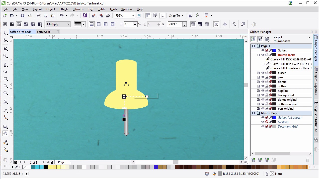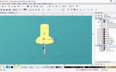 Welcome back to Advanced Techniques in Corel Draw. I'm Mary Winkler for tuts+. In this lesson, we're gonna complete our chapter in creating office supplies with some conflict thumbtacks for the left side of our composition. Dust off those shape building skills once more and let's dive right in. I've created a new layer in my object manager for this lesson. As you can see on the right, each item has its own layer associated with it, and they're labeled so its contents are easily understood. Zoom in to the upper left of the page. This is where we are going to build, and ultimately place our thumbtacks within our composition. Using the ellipse tool, draw a small, horizontal ellipse. Duplicate it and use the pip tool to widen the duplicated ellipse. Align the two ellipses to their vertical centers in the align and distribute docker. Draw a rectangle between the two ellipses. Its width should match the width of the top ellipse and hit both the ellipses centers. Zoom in a bit and make sure these items are aligned. In the shaping docker, load the top ellipse and the rectangle together. You can adjust the width of the newly welded shape if you use so choose. Center it vertically with the ellipse again. Use the pick tool to pull the ellipse, increasing its height. Now your shapes look like a tiny top hat. Grab the pen tool from the toolbox. Use it to draw a curve starting at the left of the ellipse and curving up and to the right on the cylindrical shape. Duplicate this shape and mirror it horizontally for the right side of the thumb tack. Adjust your shape so as you see fit. Group it all together. Draw a thin vertical rectangle and fillet the corners, rounding them all out. lengthen and scale it as needed and place it beneath the larger thumbtack shape. Center the group in this new shape vertically. Now that we have our basic thumbtack design, it's time to render it. Select the rendered rectangle. Apply a fountain fill to the tack and set both colors to grey. And a third color in the center and set it to light grey. Hit smooth fill, zoom in on your tack and use the interactive fill tool to adjust the gradient manually. So that it looks like a shiny piece of metal, similar to the metal that's of the pen we created earlier in this chapter. Zoom back out and duplicate your tack shape. Set the fill to uniform gray fill. Under transparency, hit multiply and apply a fountain fill transparency. Place this under the yellow part of your thumb tack and align it with the metal bit previously made. Use the transparency tool to adjust the fountain fill so that it forms a dark cast, shadow on the middle portion of the tack. Make sure your other tack shapes are welded together, the plastic portions. Set this ships full color to a fountain fill, with light yellow in the center and a darker yellow on either side. Adjust your fountain fill angle as you see fit in the docker or with the interactive fill tool. Use the pen freehand or bezier tool to draw a shadow shape on the thumbtack, using the freehand tool to draw large shape over the lower portion of the thumbtack. Choose dark yellow or yellow orange of your choice as the fill color. This would be a great time to use the blending technique for choosing colors or color pallets that we explored while making the donut's frosting in the previous chapter. In the shaping docker, with both shapes selected, hit Intersect. Delete any extraneous shapes. Use the transparency tool to apply a fountain fill transparency in the shadow shape. Set the angle of the fill so that it starts at the upper left and is pointed to the lower right. Adjust as you see fit. Repeat this process, with the creation of a shadow shape on the left side of the thumb tack. This time I´m gonna use the pen tool to create it. I´ll be creating a curve that protrudes between the barrel and flared portion of the thumbtack. Set the fill color to a dark yellow, or yellow orange. Intersect your objects and once again use the transparency tool to apply a fountain filled transparency. This time my transparency will be elliptical with the darker color in the center and the transparent one on the outer edges. Set the blending mode to multiply or color burn. Draw an ellipse for the top edge of the thumb tack. Set the fill color to the same dark yellow used for the shadow shapes and apply a transparent fountain fill to it while you're at it as well. Group everything together, zoom out and apply a simple drop shadow to your thumbtack. Duplicate your tack a couple times. Move and rotate the duplicate tacks around your page. Copy the drop shadow from the first thumbtack with the drop shadow tool. Move them around in your composition as you see fit. This concludes chapter five. Thank you so much for watching this lesson on building thumbtacks from basic shapes and fountain fills. In the next and final chapter, we'll add some finishing touches to our design by way of coffee stains and some pen doodles on our napkins.