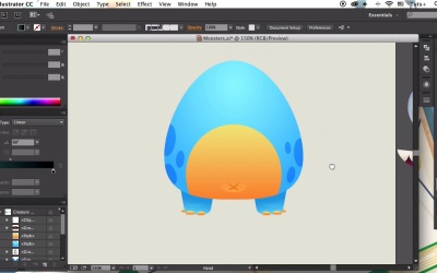 Hello everyone and welcome back to cartoon creature design course with Yulia Sokolova at tuts+. In this lesson, we'll be creating the body of our third monster. Making a sleek funny alien with the help of basic shapes and the warp effect. Let's begin. Let's make a new layout for the body. Use the ellipse tool to make a 300 by 300 pixel circle. Make it a bit smaller if you feel like the shape is too large, and move the side anchor points down, making the bottom part flat. Let's apply blue shades to the body. And change the type of the gradient to radial, making the shape dimensional and spherical. Make the colors more vivid. Make a circle for the tummy. And align it to the body. Use the shape builder tool, holding alt, to cut the unneeded bottom piece. Apply a linear gradient, and let's pick the bright yellow colors for the tummy. We can still edit the side of the shape and use the shape builder tool to make it fit the body. Let's pick a dark orange color, and take the ellipse tool to form a funny belly button. Make a thin, squashed ellipse and rotate it to 45 degrees. Use the reflect tool to make a copy, forming a cross. Make the stroke wider, and group the shapes. Go to Effect > Warp > Arch. And set the horizontal bend value to -30%. Expand the appearance to apply the affect. Draw a circle around the belly button. And pick the appearance from one of the highlights on the other creature using the eyedropper tool. Adjust the position of the gradient and the size of the shape, making the belly button pop out. Align the belly button to the center of the body. Let's make some spots through the body to make it sleek and smooth. Draw an ellipse overlapping this side of the body. Add more spots varying the sizes. Hold Alt and drag to copy the spots, rearrange them, and place on the other side of the body. Fill the spots with blue color and switch to multiply mode, making them dark and semi-transparent. Copy the body shape and paste it in front. Bring the shape to front above all other shapes. Select the spots and the top shape, and Make Clipping Mask, hiding overlapping parts. Take the rectangle tool and draw a shape for the leg. Go to to Effect > Warp > Arc. And set the distortion vertical value, to -25%, making the shape wide on top, and narrow in the bottom. Expand the appearance and use the [INAUDIBLE] feature to make the corners rounded. Select the shape with direct selection tool and pull the circle markers to the center. Squash the shape and let's add the claws. Use the ellipse tool to form small shapes. And pick the orange color from the tummy. Select the bottom anchor point, and move it up a bit, making the claw flat. Send it to back. And make a copy for the second claw. Squash it a bit. And add a third claw, making it smaller and rounded. Select the leg shape and pick the appearance from the body. Change the gradient to linear and added its direction. Group the elements of the legs and send them to back beneath the body. Make the leg darker to separate it from the body. Move the side anchor points down making the shape more squared. Now let's add a knee. Make an ellipse above the leg, and pick the color from one of the highlights. Place the gradient vertically. And group the shapes. Use the reflect tool to copy the shape and flip it horizontally. Group both legs and align them to the body. Send the legs to back, under the body. Now let's add the arms. Make a narrow shape with the ellipse tool. Drag the side points down, making the shape wider in the bottom. Apply the arc effect with -25% vertical band value. Make the shape a bit smaller. And expand its appearance to apply the arc effect. Attach the arm to the body, making the parts fit each other. Place the gradient horizontally to make the arm more dimensional. Now take the pixel tool and draw a small fist. Send it to back. Group the arm And use the reflect tool to make a second one. And let's add some more details to the body. Copy the body and paste it in front. Make the copy smaller. And pick the appearance from the highlights on the leg. Make the gradient go from top to bottom. And finally, let's attach the face. Take the one-eyed smiling face that we created previously. Resize it to make it fit the body. Select the circle shadow under the eye, copy it and paste in back. Pick the color from the arm. And change the type of the gradient to linear. Place the gradient vertically. And set the opacity on the lower side to 0% in the gradient panel. Let's add a couple of funny alien ears to our handsome guy. Take the ellipse tool and make a narrow shape. Move the side anchor points to the left deforming the shape. Use direct angle tool to add a stripe for the tube. Let's apply the bulge warp effect. With minus 10% horizontal band value, making the middle of the shape narrow, extend the shape. And let's increase the effect. Open the appearance panel, click the warp bulge effect, and set the band value to about -30%. Click the duplicate button to add another warp effect. Select it, and apply the arc effect with -7% vertical bend value. Click the bulge effect again, and increase the value to -45%. Now we can expand the appearance of the tube to apply both effects. We can still edit the shape, moving its anchor points with the help of the direct selection tool. Bring the ear shape to front and pick the colors from the body. Edit the position and the shape of the radial gradient to make the tip of the ear light blue and the whole shape more realistic. Apply the same colors to the tube, but make the gradient linear. Copy the rounded ear shape twice. And move the upper copy to the left a bit. Select the two shapes, and use minus front function of the path finder, to cut off the unwanted path. Pick the appearance from one of the shadows, to make the ear more detailed. And let's change the gradient on the tube back to radial. This way, adding dimension to the shape. Use the ellipse tool to add a group of spots on the tube. Pick the appearance fro