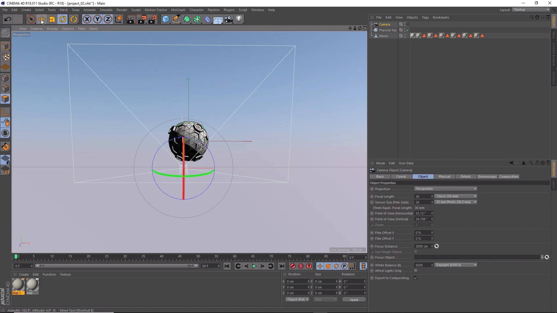 Hi, everyone, and welcome back to Create a Low-Poly Moon with Cinema 4D. In this video, we'll take a look at how we can use the camera tool. So the first thing that we want to do, for introducing the camera into our scene, is to rotate and move around the scene until you're happy with the way that it looks. Once you're happy with the way the moon looks on the screen, simply click on the camera tool at the top here. Just the camera. Now, the first thing that you'll want to understand about using the camera, is this little square button next to the camera in our list view here. Now, notice how that it's colored black at the moment. This means that we can move about the scene as normal, like so, without affecting the camera. So we can move around, zoom in and out, rotate, and so on. Now if we actually zoom a little bit here, we can actually see the camera in our scene. And we can also see where the camera is looking at, indicated by these lines here as well. So you can see how this is actually what we're looking at in the camera lens. Now, using this option we can actually move the camera as you would a normal object. So we can actually use the move tool here to move the camera around like so, and we can also use the rotate tool to move the camera around as well, like so. Let's go ahead and Ctrl+Z to undo that. Now, if we go back to this black square here and click on it, notice how that we've actually zoomed into the camera, and also this black square turns white. This means that we are actually seeing into the viewport as if through the lens of the camera. Now when in this mode, anything that we do here directly affects the view for the camera. So, if we pan across here or rotate, you'll see that this is actually rotating the camera. Now, this might be useful if we want to treat the camera tool more like an actual camera. So you can actually look at exactly what's the camera's looking at, and what adjustments you're making in real time. Always make sure to know at what mode you're in, by looking at this square button here. One of the things you don't want to do, is you don't want to navigate around the view port, just to find out that you're in camera mode and lose your composition. So that's it for this video, in the next video we'll take a look at how we can render our moon. See you all there.