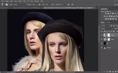 Hello everyone, and welcome back to this course. In this next lesson, we'll be merging two trendy effects in one. We'll create a duotone double exposure with exciting pink and blue colors. Just like in our last effect, we'll be using two photos of the same model to create this double exposure look. In this case, we have a stunning blonde model with a high fashion look, featuring a fur coat and cute bowler hat. Let's get started. When it comes to creating a duotone look, it's important to select photos with a very powerful expression. It's even better if you can get two photos of the same model facing different directions. The first picture has her looking off to the side, while the section picture is much more straight on. This will create a dramatic effect that is moody and high fashion. Start by adding the second model photo onto this document. Hold Ctrl+A to select the image, then copy and paste it above the first model layer. Even though I usually like to work directly onto the original photos, sometimes I realize that photo size is just too big. So to save file space, you can go to Image > Image size and decrease the value of the width and height. Here, I'll change the width to 1,500 pixels for a much smaller document size. Select the background layer and turn it into a regular layer. Do this by double-clicking it and renaming it Model1. Then, rename the second layer Model2. To complete this particular look, we'll need to separate this model from the background. To do this, grab the polygon and lasso tool and create a rough selection around the model. Make sure to keep in mind that in this photo, the bowler hat gets lost in a dark background. So give yourself a little bit more room with your selection. Once your model is selected, hold Ctrl+J to paste the selection onto a new layer. In order to fit both images into this composition, we'll need to move the model to the side. So use the Move Tool to bring the new model layer over to the left, until her hand just hits the edge. If you're working with different photos for your duotone look, keep in mind that this next step might not be necessary. Especially if you have a clear white background, all you'll have to do is eliminate it completely. But in this case, we'll need to create that dark blue look yet again. In order to get a color that matches the background as much as we can, we'll need to source the color with the Eye Dropper Tool. To do this, hold the Alt key to source this color as your new foreground color. Select the Model1 layer and create a new layer above it. Then fill the layer with dark blue. With the base of the composition set, let's take a quick moment to reorganize our layers. Set the background layer to BD, then rename Model1 to Original, and the new layer copy to Model1. Unhide the visibility of the second model layer to create another selection. Use the Polygon or Lasso Tool again to create a rough selection around the model. This photo is a little bit more clear than before, so this time we'll be able to see exactly where we need to work around the hat. Once the selection is complete, select the Model2 layer and right-click to select the inverse. Delete the background, then position the model to the lower right side. If you need to, take a moment to continue reconfiguring the composition to one that you like. You can resize the image in the front for a much better look, or keep the photos at relatively the same size. Now, refine the mask for the Model1 layer. Select the Brush Tool and use a soft, round brush with 0% hardness. Switch the foreground and background color to black and white to paint black onto your layer mask to hide the rest of the background. Zoom into the areas that are particularly difficult, like around the hair, face and coat. If you need to, lower the size of your brush so that you can get into the tight crevasses of the fur. Since the image blends well with the bark background we already created, this step is relatively easy. Feel free to erase more parts of the coat for a much more softer effect. Once the first photo is complete, it's time to move on to the second layer. Now, add a layer mask to the Model2 layer. Using the same soft round brush from before, begin to mask away the harsh edges of the photo originally created by the Polygonal Lasso tool. Just like in our previous manipulation, we can use the Rotation Tool to help us get around these edges. So rotate the canvas to help you create a cleaner mask around the hair and hat. Switch over to a hard round brush with a 100% hardness to help you refine the edges of the bowler hat. Keep going until you have a similar result like this one. Now, switch back to a soft round brush and make the brush much larger in size. Mask away the harsh edges of the Model2 layer that start to interfere with the background photo. Here, I decided to keep the effect really soft by allowing the hand in the back to show through. As you get further along with the composition, now we can begin experimenting with layer blend modes. So set the layer blend mode for the Model2 layer to lighten. Notice this area around the model's lips? We'll need to refine the mask of the Model1 layer again to help the photo in the front show through. Use a soft round brush to do so, and feel free to not take off too much. Now, for the color. To create this duotone effect, we'll be using adjustment layers and beautiful gradients. Create a new adjustment layer of gradient map above the Model1 layer. To make sure this gradient only affects the left model, right-click the layer to create a clipping mask. Now, feel free to click through the different gradient map presets to find a color scheme you'll like. I've decided to go with this beautiful custom made blue and orange gradient. Once you add the first gradient map, you'll start to notice the edges of your photos a lot more. So make sure you go back to the layer mask and refine them with a hard round brush. Now, let's color the front pho