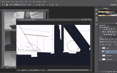 Okay, so we just kinda got the line art kind of in a good spot. We're gonna kinda refine it, but we'll probably do that as we kind of, you know, go with the color. So what I'm gonna do is I'm gonna merge all the stuff down. Real quickly so we have that, we'll flip it a little bit and we'll see if we need to kind of refine certain things so I'm kind of already looking at it we could probably refine this line so it goes a little bit more outward, otherwise it's gonna feel a little bit weird here. And we're just gonna keep, we're gonna keep going here. We're gonna keep kind of working our way through this and, and sometimes there isn't much of a explanation for this. It's more so kinda, kinda painting by feel which will kind of happen the more you do it. You kinda want to get that mileage in. But I think for now we're gonna leave this alone in terms of the composition. I think at this point, I think it's better off if If we just kinda start getting into some of the blocking and the values and the color, and start doing that, I think that will probably be a better situation for us. If we do that kind of stuff. So, as it comes through, you know, if I do make changes, in terms of the composition, I will definitely let you know. But I think for right now, I think we're pretty set on this guy in terms of what I'm seeing. So let's get right into it. In terms of color, what I do is I have swatches available and I save a bunch of swatches whenever I'm taking photos and stuff like that. So that way I don't have to worry, I don't really have to worry about picking colors because the colors are kind of already chosen for me. So before we begin let's actually set this out as composition. And let's just set this out as line art just have good housekeeping of course. So back to colors I kinda like to find photos that I like. So I usually like to take my own photography and then extract a color palette out of it. So I'm gonna show you how to do that just in case you guys do not know how to do that. So here's a photo of outside of my apartment, very very nice. Don't mind that it's actually Kevin, we're doing some oil paintings outside. It's a good way to practice color, if you are interested in color. Usually about once a week I go outside my apartment, or outside by the water and me and my friends, my colleagues, we'll do some oil painting and it helps you understand color a little better. Just because you have to mix in the colors all the time. And you don't really have, there isn't much leeway when it comes to making mistakes. So if I make mistakes with color, it'll be very, very apparent traditionally as opposed to digitally where you have unlimited color. So you have to learn how to mix the colors, you have to learn how to see things, and I think with traditional painting too, it helps you kind of breakdown complex things into simple shapes. And this is kind of where I'm getting this from a little bit is when I paint traditionally. When I look at stuff like this, I kinda draw them with a brush and it helps me kinda break down the values, and break down where the color is, and break down, you know, where the warm and cool tones are. So I'm just kinda letting you know, this is kind of where that is coming from. So, when I do this let's say you have a photo from your phone, from a painting, or something that you've seen that you like the colors. And you wanna kinda use it a little bit. What you can do is you can go to Image Mode and go to Color Table. So we'll click on that, and look at that, nothing happens, right? So that's kinda weird. Why can't I do that? Well, it's because you have to go to Index Color first, so just to kinda let you know, the end game is to get to this guy right here but we have to go to Index Color first to activate that. It's a very weird thing, I'm not sure why they do that, but just to let you know. So if you look at this let's put in here. What it's gonna do, by default, it's gonna say whatever number you put here, it's going to extract that many colors in order to make the painting. So, if I put five here, and I hit okay, what it's gonna say, it's gonna say okay, with five colors, we're gonna make this entire painting. So it kinda goes black and white. It's kinda looks a little bit weird. If I go up to 15 colors Right. You can see it's little bit more green but we're not getting any warm tones. If I have up to 20 colors you can see the warm tones are coming back and let's go to maybe 50 we're slowly kinda getting there, so the highest you can go is 256, actually. So when I actually hit OK, you're gonna notice that it becomes very, very pixelated. That's because there isn't much of a gradient anymore because it's literally saying With these 256 colors we're gonna make this photo right here which is awesome. So you can actually simplify paintings too by doing this as well. So you can see how grainy these colors get. But that's okay you want that. So what actually happens is when you go to it, now the Color Table is now there, right. And so we can click on that guy and look what happens. It actually takes all of those color palettes, it takes all the colors from that photo and it puts it in a nice palette for me. And from there, you can save it out. And so let's just save, real quickly. We'll save it right here, and we'll just call it test_color_pallette. Okay? I think I spelled that right, I think it's two l's and two t's, eh, I'll look it up later. We're here to draw, not spell, right? Okay, so hit OK. And so if I want to load that file up, I would wanna go here and I wanna say Replace swatches or load swatches. You can do replace, but we'll just load them up for the mean time. And what would happen is, you would go to that, to that part, wherever it is. So, I have to kind of go to that folder where I saved it. And if you look for it, it's not going to be there. The reason why is you have to turn it to an ACT file. So by default, I don't know why Photoshop does this It makes i