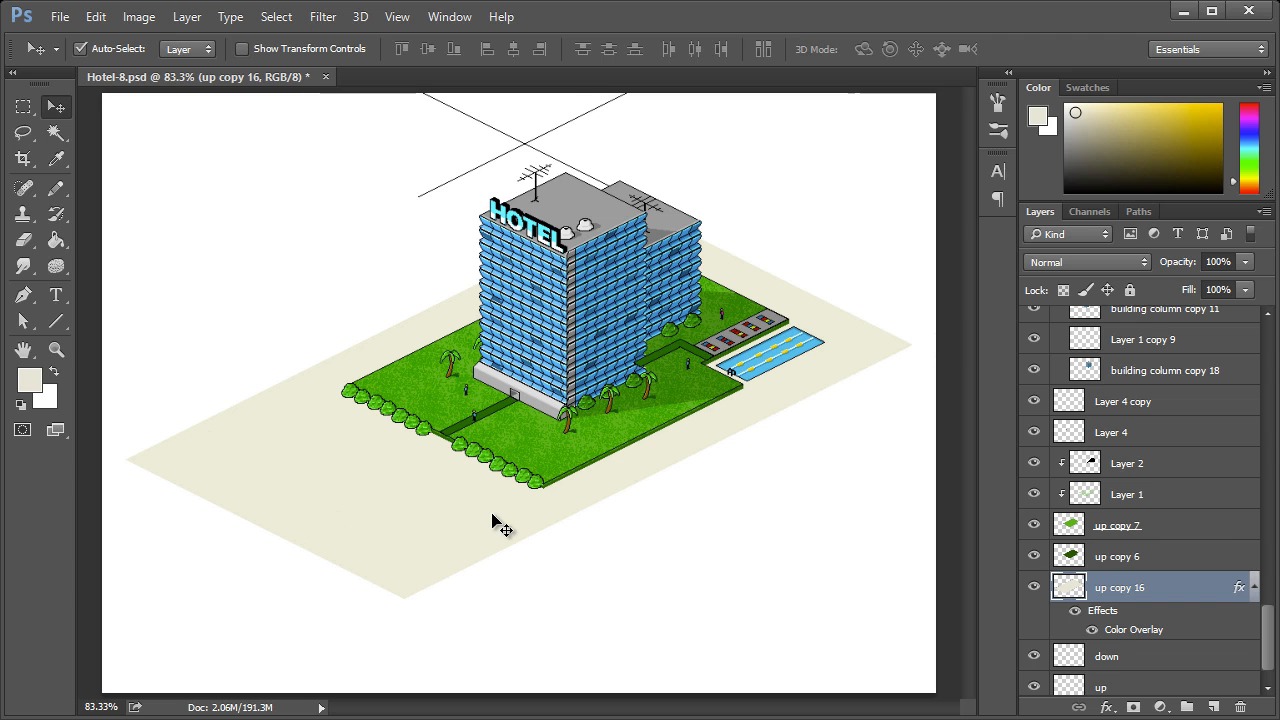 Now we will add a large outside beach wrapping around the grass and the hotel. We will also add an ocean with some pixel-based water ripples.