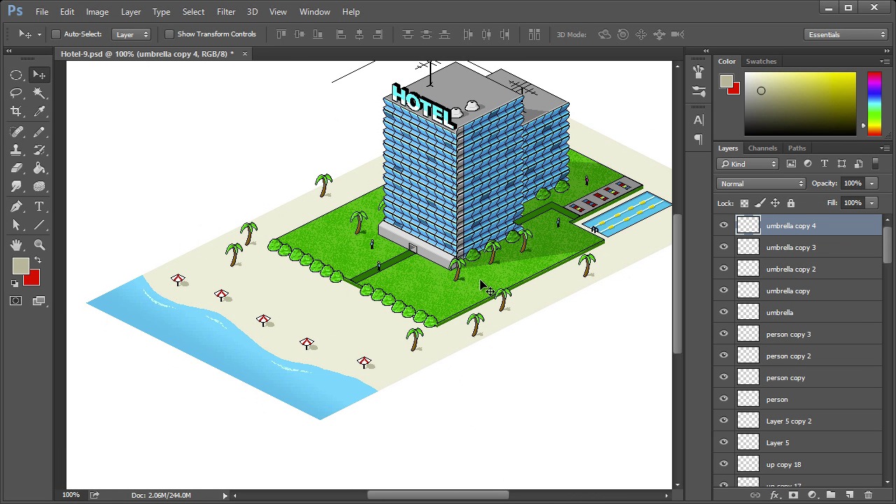 For more detail, we will create a series of umbrellas, along with beach towels. We will also use our previously created individual and modify the colors and form to populate the beach with people.