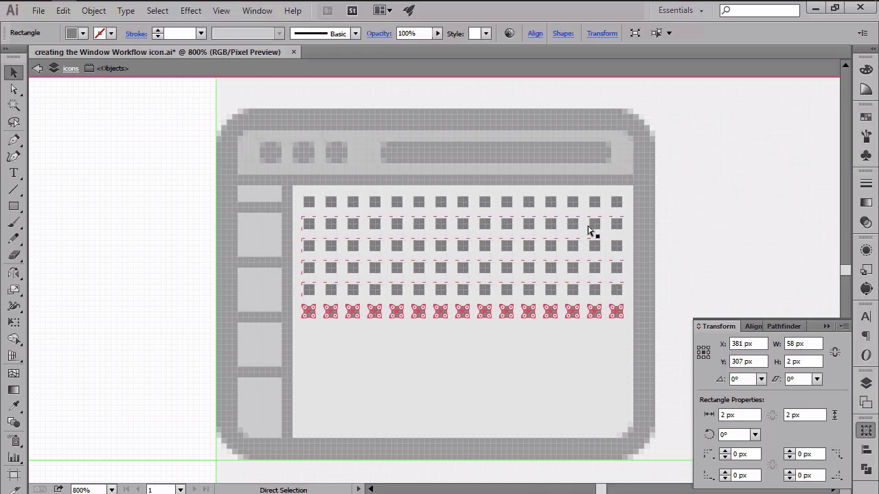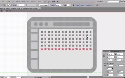 Hi, and welcome back to creating pixel perfect icons in Adobe Illustrator. My name is Andre Stefan, and you are currently on lesson 4.3, creating the window workflow icon. So, if in the previous video we've learned how to build the first icon using Illustrator's basic shapes, in this one we will continue developing our icon set by creating the second one. That being said, open up Illustrator and let's start from where we last left off, by positioning ourselves over the second guides and grids. Now, using the round or rectangle tool, let's put the 72 by 56 pixel shape with our 4px corner radius. We will color the object using a light grey, and then give it an outline of 4 pixels. With both shapes selected, position them so that the left and bottom sections of the outline touch the left and second horizontal guidelines. Once we've correctly positioned the shapes, we can start working on the top bar by creating a duplicate of the inner section using the Ctrl+C, Ctrl+F shortcuts, which we'll then adjust by removing its bottom center anchor points, and shortening its height to just 8 pixels. Then we can add a title bar buttons by drawing three 4 by 4 pixel circles towards the left side, which we'll color using a darker shade of gray. Next, move over towards the right, and add a 42 by 4 pixels rectangle, with a corner radius of just 2 pixels, which will act as a navigation element. Now, since we need to delimit the top bar from the main interface, we will have to add a 72 by 2 pixels rectangle right underneath it, which will act as a thinner outline. Once we are done with the top bar, we can start working on the left-sided buttons, which we'll create using a second copy of the larger window. As you can see, we will need to adjust the shape by moving its right-center anchor points, and reducing its width to just 8 pixels. Since this shape needs to go underneath the top bar, we'll have to select it along with the windows intersection and outline, and send them to the back using the arrange send to back option. With the shape correctly positioned, we can now start delimiting the buttons by adding four 8 by 2 pixel rectangles, which will be distributed at 8 pixels from one another. As with the top bar, we'll have to make sure to separate the bottom section by drawing a 2 by 46 pixels rectangle, which we'll then position on the right side. I will leave you in charge of designing the little pictograms for each button, since this lesson shouldn't be all that rigid. It should give you some creative freedom, in order to express your own vision. That being said, leave the button designing for the end, and let's move on towards the right side, and start working on UI prototype by putting a grid of 2 by 2 pixel squares, which we'll then distance from one another using a gap of 2 pixels on each side. On top of this grid, we will add a bunch of UI elements by simply dragging using the rectangle tool. Again, this text should be a little more loose, since you should be able to get creative and design your own elements. Once you've added the UI elements, you should select all the shapes that you have so far, and group them together using the Ctrl+G keyboard shortcut, since it will be easier to keep track and edit later on. Next, we will be creating the second window by making a copy of the one we already have, and then positioning it toward the right side, so that it touches the right and first horizontal guidelines. Since the second instance of the window will be quite different in terms of content and function, we need to get rid of the horizontal button dividers and UI elements. And adjust the width of the left section from 8 pixels to 24, all while in isolation mode. Then we can start adding some of the code lines to the left side of window, by drawing a couple of rectangles with slightly different widths over the constant to the x height. Next, add the 6 by 6 pixel circle to the lower left corner. And to one px tall lines to its right As with the button section, edit 2 by 46 pixel vertical divider to the right side, in order to separate the different areas of the window. Finish out this icon by adding a couple of new elements to the second window, while keeping things balanced in terms of spacing. So, that was it for today's lesson. Stay tuned for the next one, where we'll be creating our last icon.