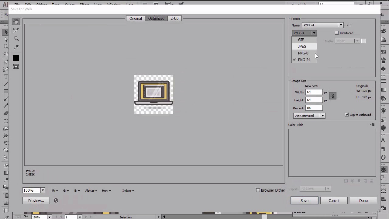 Hi, and welcome back to creating pixel perfect icons in Adobe Illustrator. My name is Andres Stephan, and we are currently in lesson 5.1, exporting the icons, which is the last one from this video course. Up until this point we've learned quite a lot. We've seen what the pixel perfect workflow involves, and more importantly, we built crisp little icon set together. During which, we covered every aspect that one needs to be aware of when creating this sort of artwork. Now it's time to finish off the project by exporting the icons so that we can put them to use. If you've always wondered how you should individually save your assets, well, wonder no more. Since in the following moments, I'm going to show you my preferred way of doing just that. Before you begin exporting anything, you should always know what formats you're going to be using for the same files. Usually when dealing with icons, I go with either PNG, or SVG, both of which will give me the option of setting a transparent background, which is something most of the times you will want. For this course, I'm going to show the process for exporting a PNG file, while the process for SVG is pretty much the same. The method itself is very simple, since it relies on using the constant build words in combination with the arbor tool. So assuming you have the document in front of you, create a copy of the file and let's start by exporting the MacBook icon. First, make sure that you have the guides and grids layer unlocked. Then select the base grid and go to object, artboards, fit to selected art. This is where we size the entire artwork to the surface of the grid, which will then allow us to export just one out of the three icons. Now, to export the icon, simply go to file, save for web, we will select PNG for the format, and then hit save after we've made sure that we checked the transparency box. It's as simple as that. Using just a couple of clicks, we've managed to quickly export our icon. For the remaining icons, we will follow the exact same process of selecting the grid and then resetting the art board to it. As you can see, the method gives us more flow, since you can move from one grid to another while keeping the focus on all icons. If this was a larger icon pack it might have taken us some time to same them all, but believe me, this method is the quickest way to do that. That being said you can now take a well deserved break since you bravely finished our little project. Thanks for listening, and don't forget to watch the next video where we'll look back at what we've learned and address conclusions.