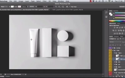 Hi there. Okay, so we've downloaded our template file and this has provided us as a ZIP file. So we can navigate where it's saved, double click to expand it, and when it's ready we can head inside the folder and see what we have. Okay. So inside we've got eight different template images in a PSD Photoshop format. And each image is going to showcase your patching designs in a different way from different angles. So let's work with the first image which just shows the whole range of packaging in a nice flat lay style which I think is just a simple on trend style that makes your designs look really clear and minimal. Double click the files to open it or drag it down onto the Photoshop icon to open it up. Okay, so here we have our template image with blank packaging. If you go to expand the layers panel which is over here to the right of the workspace, or head up to window layers if you can't spot it, you can see that the file is made up of several folders each containing different layers which make up a certain part of the image. Let's take a look. So at the bottom we've got a presentations folder and if we click on the arrow to expand and click to switch off the visibility of each layer at a time. We can see that this is the base image of the template containing the background, shadows, and the packaging items themselves. So it's good to know your way around this folder because it's not your editable folder. At the top of the Layers panel, we've got a folder called Filters, and this is a really nice touch. This allows you to apply a color wash and texture overlay over the image to give it a particular look. So you can go for a cool or warm light, or switch on the visibility of the retro filters to get the images sort of Instagram style look, or apply the dirty layer to give it more of a kind of grungy vintage feel. So this is a nice, final, optional touch you can apply to the image to suit your particular product design. We can come back to this folder and pick a filter at the end. Now the folder bang in the middle is the one that we really want to focus on because this layer, called items, contains the editable small objects that we can edit to include our own artwork. Let's click on the arrow next to tube two to expand the folder and look at the layers inside. So here the edges for small subjects that make up the design of the tube on the left side of the image. We can see that this is a small object by the little square icon at the bottom right of the layer preview. And to edit this small object is really simple. We just have to double click on the small object layer. Here I want to edit the actual tube itself, not the cap for now, so I click on tube for graphic. So here we are this is the area we have to fill with the tube image. Now just quickly go back to the original master image. When you're creating mock up images you really don't need the full packaging design to make a convincing mock up. So here, for example, we can't see the back of the packaging at all. So all you need to concern yourself with is just creating the parts of the packaging that are going to be visible on the design. Now luckily for you I've provided some flat artwork designs for these cosmetics containers as a downloadable resource provided with this lesson. So you can use these, practice with, and feed this into the template. And I'm going to walk you through how to do that. So don't worry about being left on your own. So go ahead and download the folder PNG images provided. Save them in a folder perhaps in the same folder, perhaps in the same folder as the template Photoshop file. And pause the video while you do that. I'll be waiting for you here. Okay, we're back. So we've opened this editable small object for the front of the tube. When you download a template file, the most important thing you need to do is make a note of the dimensions of each small object canvas. To find this out, you need to open each small subject and then head up to Image, and choose Canvas Size. And here you can see the width and height of the canvas in pixels. And this is the area that you need to fill completely with a flat image of your packaging. Any blank spots on the canvas are going to show up on your final image. And also if you don't match the proportions of the canvas, and have to stretch, or distort your image to make it fit, it's just going to look a bit odd, and it's gonna to lose the correct perspective. The best way to create your smart object images is to create a completely separate set of images, showing your packaging designs at exactly the right dimensions. So you might have an original packaging design file, perhaps one that you've created in Illustrator which has all the folds and the reverse side of the packet. In things like that, which you'll need to actually print and manufacture the packet. Both for the purposes of creating a mock up, is much easier if you copy and paste the relevant parts of your design onto a new document set about the size required by the smart object canvas. So this is what I've done here. I had my original designs actually set up in Indesign because that's just what I prefer. And then I created a new document in Indesign and sized each page to match the canvas sizes in Photoshop. Then I went to file, export, and exported those images as PNG files. Now the only reason I've exported these as PNG files is that sometimes, if you exported images as JPEGs, they can appear a little blurry when you place them into Photoshop. So to avoid that I usually export things as PNGs. To set up all these PNG images, you need to open each editable smart object in the template, go to image canvas size to see the dimensions. And then create a document that matches this size in your software of choice. Now we have the dimensions noted and have created the images to the right size. We're ready to start feeding the artwork into the template. In the next lesson we'll do just that, using the provided folder of P