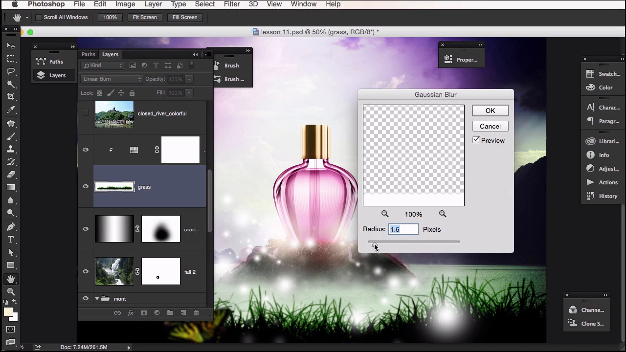 Hey this is Gavin from tuts+, and in this lesson I'd like to work on the foreground of the image. So we're looking at the graphs area and forward,adding elements such as butterflies and birds to the main composition. So I'm just gonna go ahead and drag in the elements that we need, starting with this butterfly layer here. I'm just gonna drag this in, like that. Just gonna make the image smaller. Just bring it right down. Lets zoom in and open the layers panel, right click, rasterize the layer, and then lets choose the pen tool. I'm just going to navigate around this image now to cut this out. Again, same technique as before, staying slightly within the image, using the out key when needed to control the anchor points, so I'm just gonna go around as quick as I can again, it doesn't have to be perfect, especially when the image itself is going to be quite small on the canvas. So, just going around a good tip is to try and keep the nodes as close as you can. So what I might wanna do is just go back slightly. And just gonna include this flower in the image. So, I want to keep that in. Around the integration between the flower and the butterfly. So, let's keep that in there. Again this is quite rough, but it's fine for the purpose. Go around, and back. Okay, this is caught under the wing. Remember keep the nodes nice and tight if you want to speed up your work flow. All the way around and back to the central point. Just going to right-click. Make a selection. Cmd or Ctrl + J to create a new layout. Let's hide that, and let's close that down. Back to this selection tool, and let's put this butterfly somewhere here. Like that, let's zoom out slightly. Right, let's leave it here, let's just press L and let's just bring down the tone, let's bring down the minutes, bring it right down. Bring it right down there. And, I'm going to do two things. I'm gonna blur out the butterfly, and I'm gonna blur out the grass. So, we're gonna use a Gaussian Blur and a radius of about 4, 4 is good. Okay, and let's go back to the layers panel and we can delete this layer now. Let's call this Butter. Fly on one, and let's delete this perfume bottle layer as well, let's scroll down to the grass layer, and I'm going to add assembler to that as well, but only a slight blur so I'm going to add maybe 1.4, 1.5. 1.3. Actually we've got 1.3 for now. Which is good, don't want too much blur but that's good for now. And I'm going to go ahead and in fact, I'm just gonna. Bring down the saturation on the grass lightly. And I'm not adding in just one layer here, I'm just doing it on the actual grass layer to see how it looks. Take out some of the green, which is fine. Now, what I need to do is bring in the other butterfly image. Let's drag that across, and let's bring it up to the top. Let's drag that down. Okay, let's right click, rasteurize the layout. Okay, so let's zoom in slightly, and let's do the same procedure again with the pen tool. I'm just gonna navigate around as quick as I can. Again there are other ways of doing this but find that there's a lot of tweaking involved, if we used the magic wand or the focus area tool. It doesn't always work 100%, especially on the fine details. So I tend to just use the pen tool. I'm not gonna include the tentacles. I'm going to cut them out because it's going to go to a dark background, so you wouldn't see it anyway. Let's just around as quickly as possible, around there, like that. Again, I'm just dotting around the image. Makes it a lot easier. When there's no need for 100% accuracy. Let's zoom back out, in fact let's zoom back in. And let's just add another path just here to get rid of that green, just here. So what we need to do now, if we hold down that a tool, and select all the parts that we created rather than the single. Press p, make a selection you'll see then we've got all the areas that I've preselected there, and let's press command or control J, hide that layer, see how it looks, looking good, let's bring it down to about there, and let's put that butterfly round about here. Maybe there. Right, so let's give it a blur, Gaussian blur. Let's bring it up to about three. And let's add some depth to it. Let's bring the meter right down to about there, which is good. So we've added a couple of foreground elements. In our next lesson, I'm going to add birds to this sky, and a couple more elements surrounding the mountain, possibly before we finish up with our adjustment layers and our text.
