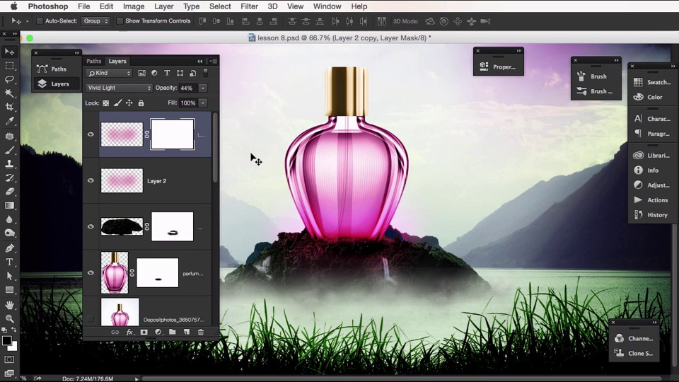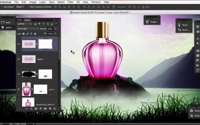 Hey this is Gavin from tuts+ and in this lesson, we're going to continue adding color and some lighting effects to the mountain area. And we're gonna play around with the elements within it to compliment the perfume bottle. So I'm gonna zoom right in, and what I'd like to do is just right click, choose the perfume bottle, and bring it down slightly so it looks more integrated with the hill. Let's choose this mount three. Hold down the Alt key, and let's just duplicate that. And let's Ctrl or Cmd + t, and let's flip horizontally. And let's put that round about there. Open the layers panel, let's go to the mask. Press b for brush. And let's just see. Okay, just gonna paint this back in. Just to see how it looks, its height there. Okay, so it's probably better to keep this layer hidden for now. Another way to do it would be to mask out the perfume bottle, so let's create a mask on there. Let's choose black, and let's just paint that out, there. And that's easier. Okay, let's zoom in. Let's go to the first one that we created around the bottle. Let's go to the brush. And let's just get rid of the edges there, smooth that out. Like that. Let's zoom out again and see how that looks. That's looking more integrated with the hill. We could always add some more to that. But what I'm gonna do for now is I'm gonna delete this layer, create a new layer, back to my brush tool, let's increase the size. And let's hold down the L key so we can select a color. What we want, so I'm gonna choose this pink here. And I'm just gonna paint that in around. There like that. Okay, now I'm gonna experiment here and see how it looks. Let's create a layer blend. Let's choose vivid light chosen there. Hard light, soft light, overlay. Linear light, vivid light, okay. So there we have some color coming off the perfume bottle. I'm just going to bring down the opacity to see how it looks. Okay, let's duplicate the wet layer and see how it looks. Let's just bring down the opacity there. Let's create a mask. And let's paint out the area in the middle on the perfume bottle. Take away some of that strong color there. And let's do the same on this layer and see how it looks. So there's not stock. Now let's zoom out. Okay, it's not too bad for now. Let's paint out some of this over here over the waterfall and just behind as well. Let's just take it up slightly. All right now, and let's open this panel up let's just call this Scent One, Scent Two, and let's group these together. Call that Scent. Let's close that down for now. Okay, so. What I'd like to do is scroll down to this pink tinted layer that we had. And I'd like to just add some more tint. So I'm just gonna choose this pink here, bring the opacity down to 10% and I'm just gonna paint in some pink here, this side of the mountain. Let's close that down, and just slightly on this side as well. Okay, just ever so slightly so we have some tint on both sides. Okay, let's go back up. Let's just hide it. I like to hide it just to see how it looks. And what we could do, bring down the opacity slightly. All right, let's close that down. And I'm gonna zoom back in, and right-click. And we've got for one I'm just going to move this, play with this, just zoom out slightly. Let's put it a bit higher and see how it looks. Let's try it there. Let's right click on that one. Fall two. Let's put that there. See how it looks. Like that, okay. Let's zoom back out. Bring it across slightly okay, so I think we're good to go with that. In our next lesson, what I would like to do is add some more scent effects coming off of the mountain, and then we're going to be adding more foreground elements I'm building up the image with adjustment layers to really bring out the colors of the composition.