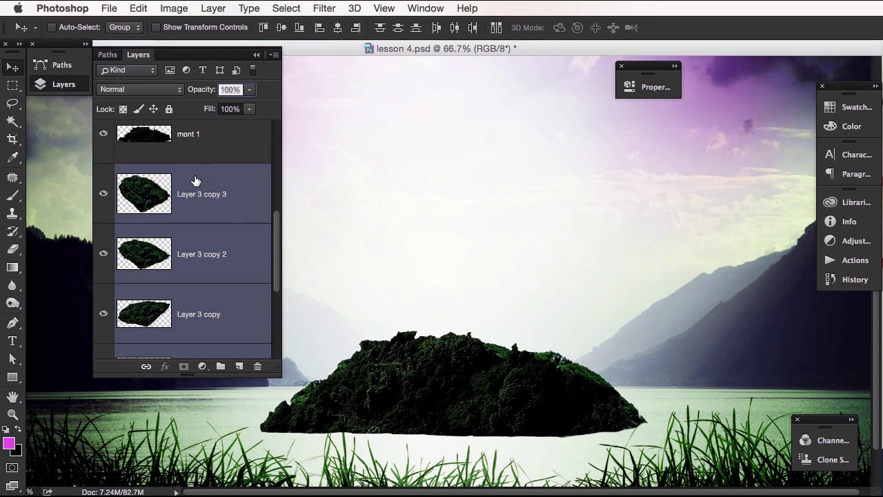 Hey, this is Gavin from Tuts+, and in this lesson we're going to continue building up our mountain. And what I'd like to do is go back to the source image that we brought in, which is this one here, and I'm going to zoom straight in. Let's navigate to the right. And I'm going to take a piece of this mountain right here, this hill. I'm just going to quickly cut this out. Right click. Make a selection. And let's press Command or Control C. All right. Let's make sure the layer's chosen. There. Let's press Command or Control C. And let's hide that. Take off these selection. Let's go back and paste it in. And, as you can see, it looks very very bright, so I'm going to open up the levels panel and let's drag it right down. Right down there. So it's a little bit lighter than the original hill that we have. Leave it right there. Let's open the hue saturation and bring that down. And I'm going to play with the positioning of this, so let's rotate this now and put it behind. Rotate that again. Try having it there for now. Open the levels again. Let's bring it up. See how it looks. Let's leave it there for now. And then let's bring down the saturation again, so it's just slightly brighter. Let's zoom back in. And I'm going to get rid of the white quickly, using the magic wand to see if that will suffice for this. On tolerance of 21, let's just take that away. That's okay for now. Let's just resize this element here. Just bring it down slightly. That's fine. Now I'm going to hold down the Alt key and duplicate that. Let's rotate that again, and let's make it smaller. And let's put a piece there. Again, hold down the Alt key. Let's rotate the selection. And let's put something there as well. And, again, let's hold down the Alt key. Let's play with the sizing of this, and let's put something there as well. Maybe here. Let's leave that there and zoom out. Okay. So we've got a little bit more depth. Now we've got a number of layers here. Let's name this Mount 1. And I'm going to take these layers, and let's hold down the Shift key, and I'm going to right-click and Let's merge them together. So if you right-click, you'll see the merge option there to merge them together. And I'm going to bring down the hue saturation slightly, just slightly, play with the brightness there, ever so slightly. Okay. And that's how you do that. Now what I'd like to do. Is. In fact, let's hold down the Shift key, select these two layers that we have, as I'm happy with it as it is, let's right-click and let's merge them together. So we've got Mount 1. Let's create a mask. Let's choose our B for brush. Let's bring it right down. And then let's bring the opacity of the brush down to about 30. Now, you could use the slider here, you can open this palette here, but I tend to use the number key, so number three for 30 percent, which is good for me. Let's try that. And let's make sure it's on black. And that's probably too strong actually. Let's bring it down to ten. And I'm just going to gently paint out the bottom area of this. This is where we're going to put our mist in the later lessons. I'm just going to gently take some of it out and give it that dreamy effect. Now let's zoom in. And let's make the brush smaller, and bring the opacity up to about 40. We're just going to take away some of the edge of the bottom. Let's bring it across. Let's take away some of the edge. Now, it doesn't have to be 100% at this point, because the mist will completely hide. We're only reducing what we can see for now. And, again, don't worry about the edge that you can still see. Let's zoom back out. Now, if it's too much, we can always go back and bring in elements in the mountain. Just going to make the brush bigger. And, in fact, let's go back to white and paint some of it back in. Just slightly over here. Let's bring it down to 10%. I'm just going to go back on four for adding and taking away until I think we're okay. All right. So there we have a mountain as it is for now. As I said, don't worry about the edges we can see here, because we're going to add the mist, which will completely hide that in a later lesson. And we're also going to add up elements to this. So it won't be 100 percent visible, but that's fine for now. So in our next lesson what we're going to is we're going to add some waterfalls to the mountain. And we're going to begin adding the mist and finishing off the elements of this mountain so we can put our main element of the composition, which is the perfume bottle, on top.