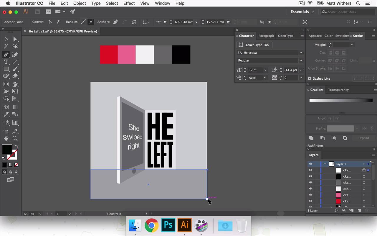 Hey everyone, welcome back to the course. In this lesson we are going to be continuing to build our final piece of artwork. In last few lessons we've been building our design, we've got the background in, She swiped right and in the previous lesson we were looking at how, different choices for that HE LEFT text, At the end of a video, I was a little unsure of which one I was gonna choose in the end. So now, I've just had a bit of time away and a bit of a break. Been able to step away from my screen, come back with some fresh eyes. I think the one I'm going to take forward is this one here. This one was a bit too light, this feels a bit too like it's digital font, even though its got some nice like sharp edges as quite boxy, and it feels like kind of, just like masculine, and angry. So it works in that way, but just the digital look of it doesn't sit right with me. So I'm counting that one out. This one I quite like. The condensed look of the font. I like that's it's quite narrow as well. It's not very bold I think that's that kind of slightly interesting too. It fells kind of quite I don't know I'm not sure how to really describe it. It feels quite like, back still got a huge amount of identity, it feels slightly cold, which is what I think works with the theme of the story. But the thing I really like about this one, is I think it's similar about what I just said about that one, about the kind of coldness of it. This feels, it also has like an urgency to it is in She's swiped right, the reaction being or the outcome being HE LEFT. I think that works quite nicely. So I'm gonna push that one forward. So I'm going to save a new version of this Version 2. And I'm going to get rid of these other art boards, just so they don't confuse me. Save that again, okay. Now we are going to look at bringing in some color into the design. And then that will help us build this and help us to kind of really refine the tone. And we'll probably refine some of the lettering. And we bring some textures in there next lesson. In this one we're just going to start choosing some colors to really help bring it to life. So I've already been thinking about colors and what we can work with and as this is a story of, it's love and heartbreak, most appropriate colors that comes to mind, like reds, maybe some pinks in there. But then if you mix those with black and white as well, that's a nice strong contrast between them. And I think those colors mixed together can really create an urgency to a design as well as get across the romance side of the story too. So what I'm going to do is draw boxes across the top here and then we are going to use these. Probably going to choose about four or five different colors, and I'm going to do that because I wan this to be quite a flat, graphic looking design, and we're going to have different tones for the back wall and also the floor there. How the light starts spilling out from the doorway into the room as well so I'm gonna draw on some different sections in a moment as well just to get some different lights, different tones in there. But I don't want to go crazy with a bunch of different custom colors for each individual part of the design. I want to just try and keep it to four or five colors. And use each panel each section keep them all within those designs, I think that can look really strong and bold. And also still vibrant and also it kind of plays in nicely as well with keeping things quite simple and helping you to kind of really look into the design, and try and intrigue you and make you work out, draw your attention to the fact that it is a phone. So let's start looking at these colors. So, we're going to choose a nice, bright red. And then the next one I want a lighter version of that. Maybe like into a thermal pink color. Then we have a white, there's kind of a gray in there. A dark gray. We may need another, another grade, a different step in that, so we're gonna go with those for now, and I'm just gonna draw on the light parts. Different sections of light coming through the door. So that's going to line up with the bottom of that doorway there. Okay, I'm going to send this block to the back. So to do that, that was Shift+Cmd and the minus button, but I don't want it to go to the very back. I'm just gonna bring it forward a few times. So now let's start building the colors up, so. And as I do this I may bring in new colors into the design. In fact I'm gonna do that immediately I think. I should, let's try that one. No pink isn't right. We're gonna need another grey in there. Okay. Okay, try pink for that, actually. And then, this part of the door frame as it's coming around the corner, we're going to say that, in reality, this would be the same color as this shadowed part of it. It's going to be a deep color. So we're going to choose the red for that section of it. Same for that bit. And then text inside it, actually let's try that with red, might feel unrealistic if it is red. How's that look if it's black? And then black works quite nice. Okay, I'm not so keen on this pink. I think it's a bit too marshmallow-y. Maybe if we go, yeah that's a bit better. Okay, now this section down here. I don't want this whole section to be black. I want to distinguish between the floor and the wall. So to do that, this can be Maybe that gray there is in service. Say this is color A and then A has two different, that's the shadowed version of A and that's a lighter version of A. So that's shadowed version of it and that's the lighter version of it. So that's beginning to come together. Okay, I'm happy with how that's looking. I think I'm just going to try another version of it using roughly the same colors. That I'm just wanting to see how it can look if we maybe change this part of the door frame to black maybe. Let's give that a go, I'm gonna duplicate it just so we can have them side by side so we can compare which one we like the best. Yeah, maybe we don't need the pink at all.