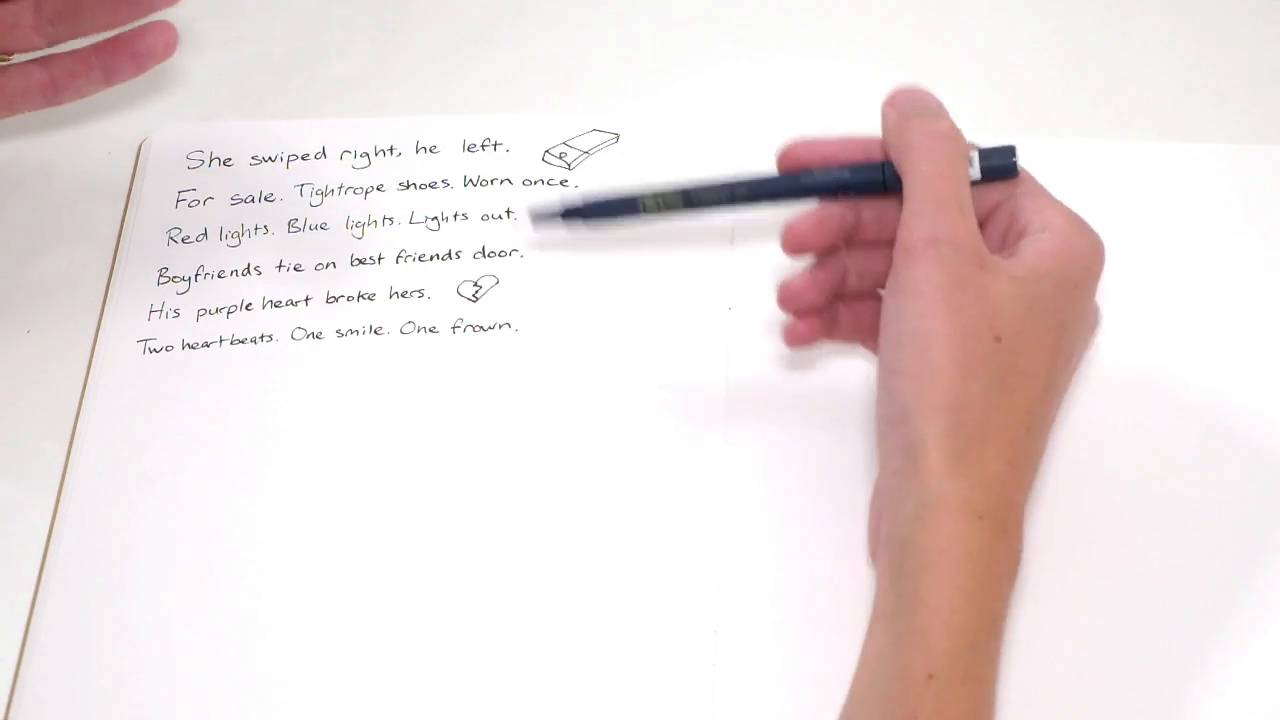 Hi everyone, welcome back to the course. In this lesson, we are going to be reading through the stories that my friend Phil has written for me to design to. So I'm going to read and write them all out and then describe what I like about the stories. How I think we can use, what design elements we can bring out to them and how we can push them forward. So I will just start right in the middle and, yeah, here we go. The first one is she swipes right, he left. The story here being that there's a boyfriend and girlfriend together. She's on her phone on an app like Tinder or something, swiping right, getting in touch with different men and he has left her because of it. So I immediately feel really good about this story. Like, I think there's lots to play with in terms of the digital apps phone, I really like the shape of a phone to play with, just a few basic rectangles and circles very easily make up a phone shape. And that's quite a fun thing to be able to play with unlike the actions of swiping and leaving and also the directions of right and left, maybe you can use those in some way. So yeah, immediately feel excited about that one. The next story is For sale, Tightrope shoes, worn once. So this story is sort of referencing another quite famous short story which is something like for sale baby shoes, never worn. Which is obviously quite a sad story, whereas this one takes that and kind of makes it into slightly like a dark humor thing. As in someone has been wearing these tightrope shoes and have fallen off and died so the shoes are for sale again. I think this one getting across that from a dark humor and the design would be quite fun to play with. For sale, those words, you can use that in some way, maybe in print like in a newspaper ad or maybe it's, if you take it digitally, and it's on Gumtree or something like that. And tightrope, you've got height to play with there, and so yeah, that one, again, feels exciting, and I think you could probably do something quite interesting with all of those elements. The next story is Red lights, Blue lights, Lights out. So this story here being that someone's driving. They've gone through a red light, crashed, blue lights turn up as an ambulance. Lights out as in they've died. This one like immediately, you could do something with red, blue like the colors lights out, maybe we can phase black, traffic lights, those kinds of things. There's elements best play with, the story itself, not quite so interesting, perhaps. At least as the other two, I think there's something more interesting in those two stories. This one doesn't take me quite so much. So the next story is Boyfriend's tie on best friend's door. So this story is about someone's boyfriend cheating on them with their best friend. So you've got betrayal in there immediately to play with. You've got shapes of a door perhaps, the tie on the door maybe you can use that in the lettering somehow, like for words come up from the tie perhaps. Be quite fun to play with the ideal of betrayal in that, trying to bring that emotion out and so maybe there's something we can do interesting in this one. The next story is His purple heart broke hers. Now, if this one, the story is essentially a man going off to war, dying and leaving his love, back home, heartbroken. Broken hearts, that's quite a straightforward graphic to play with. Color purple, like sadness, getting that across in this former story. This one doesn't make me as excited as the rest. I think the other ones are slightly more interesting storywise than this one. So the next story is, two heartbeats, one smile, one frown. [COUGH] Now this one, the story is two people going to a check up for pregnancy and they get the news that they're having twins. And that's in their two heartbeats. One of them reacts happily to it, the other one is not quite so happy, so they're frowning about it. This story, I think, you could take that into quite a nice place. As in, you allowed to contextualize the story anyway we want. So I think, so you could make it it's a happy occasion, it's a wanted pregnancy. So one of them is really happy that they're gonna get not just one baby but two babies. And then the frowning person, it doesn't have to be a sadness thing, it could just be a troubled by the news, it doesn't have to be a giant problem. So you kind of make the tone of quite like, a little bit cheeky and playful, and then heartbeats as well, you've got that classic heartbeat monitor thing that you get in hospitals. So yeah, there are some interesting places you could take that one. The next story is I forever held my peace. So this story is about someone who has gone to the wedding of someone they love. And in the ceremony when the question is asked, speak now or forever hold your peace, this person has held their peace. And so this one, there's things you could do with like the wedding and that kind of brings quite a familiar aesthetic like swirly hand, western like calligraphy things and invitations, there's confetti. Like white for wedding dresses, things like that. And then, there's also the heartbreak and the sadness of it to try and get into the design as well. So you could be quite like a interesting juxtaposition that you end up we would try and get this weird battle of the happy day of a wedding, but then also the sadness that this person's feeling. That could make something quite interesting. Honeymoon suite for one is the next story. And this one again, in the context of a wedding, so you can use the same traits that I was just talking about. About confetti and things like that, honeymoon suites, you got honeymoon door like hotel room door signs. Maybe there's something to do with that. So the basic story of this one being that it's her wedding day, something's gone wrong and only one of them has gone to the honeymoon suite, who knows what has happened to the other person. And so there's heartbreak to get across in that one, too. The next story is H