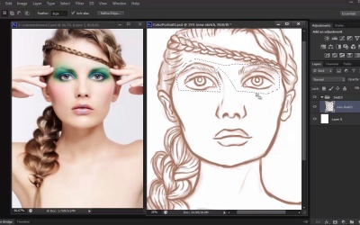 Hello, and welcome back to Digital Portrait Painting and Adobe Photoshop. My name is Melanie Nueves and this is lesson 3.2, Exaggerating Features of our Digital Portrait. In the first lesson of chapter three, we covered the tips and techniques to sketching your model as best as you can. In this lesson, we'll take that same sketch and exaggerate her features using a simple scaling technique. Referencing the photograph is a normal part of creating digital portraits. But sometimes, it’s fun to change a sketch to add a little uniqueness and separate it from the original picture. If you're familiar with caricatures, then you already know they are drawings or paintings where an artist creates interesting portraits by exaggerating the features of his model. Typically, they end up with large heads on small bodies for a funny cartoonish effect. But the key to a great caricature is making sure there is a distinct balance between exaggeration and likeness. So no matter how much you bulge someone's eyes, it's important that your painting still looks like that person in the end. And great caricature artists are able to warp and exaggerate their subject's face to such an extreme extent while somehow maintaining great likeness. Now don't be too intimidated by what I've just said, because for this portrait, we'll only be slightly exaggerating our models features to achieve, sort of like a beginner's caricature effect. And since our model already has a great focus point with her beautiful eyes and bright eye makeup, we can focus our attention there. Zoom into your sketch to get a clear view of the eyes. Now, use the Polygonal Lasso Tool to create a selection around both eyes. Don't forget to include both eyebrows in your selection, too, so that they also get affected when scaling. If all of your sketch is on one layer, you might have to go around other features, like the nose, hair, or sides of the face. So, take your time with this step. You can also just trace around one eye first, then hold the shift key to add a second selection for the other eye. Once you have both eyes selected, right-click and go to Layer Via Cut. This option cuts and pastes your selection onto a whole new layer separate from the rest of the sketch. Notice how when I toggle the visibility of a new eye layer that only the eyes and eyebrows are hidden. By putting them on their own separate layer, we can edit the eyes much easier without affecting anything else. To enlarge the eyes for a fun caricature effect, Ctrl+T to free transform and hold the shift key while making the eyes much bigger. Since this step displaces the eyes a bit, you'll have to go back in with selection tools like the Rectangular Marquee Tool to reposition the eyes into place. At first, I almost repeated this step with the nose, but eventually decided against it because I didn't think it worked out too well. Changes like this are something you just have to fill out. So, don't think that you have to change everything in order to make it work. I did, however, decide to repeat the step on the lips. Selecting the lips first then cutting and pasting them onto a new layer, I Ctrl+T to free transform them. This time, instead of making them bigger, I made them much smaller for an added emphasis on the model's large eyes. If you feel the need to continue tweaking the placement of any feature, continue to do so until you're happy with it. And once you're finished with any last minute tweaks, merge all layers together for the final sketch. And that's it for this simple technique. Always experiment with a Free Transform tool to see how you can make your sketches more unique. And join me in our next lesson where we'll start prepping the sketch for painting.