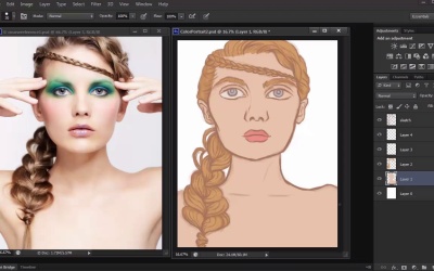 Hello and welcome back to Digital Portrait Painting in Adobe Photoshop. My name is Melody Nieves, and for lesson 3.3, it's time to add color to this portrait. But first, we need to prep it for color. Many artists like to use already-made swatches for the color scheme of their paintings. But if you remember from earlier, I closed out of the swatches panel to free up some room for my work space. The other reason why I did this is because I try to avoid using swatches unless it's absolutely necessary. Every person you paint varies in color in skin tone, so I'd hate to get too attached to using the same swatches over and over again. Of course you can approach this decision in the way that works best for you. But for me I'd rather learn to create the base colors from scratch for each new painting. Although figuring out the base colors for your portrait can seem hard, it really isn't all that bad if you let hue and saturation help. To prove this, I'll fill in the model's skin with a bright color that you wouldn't normally use for skin-tone. Go to color picker and select a bright random color to fill in your sketch. I decided on this beautiful greenish-blue color. Now use a hard, round brush set to 100% opacity with no pen pressure enabled, to begin painting on a new layer. To change this color to a more recognizable skin tone, let's go to image, adjustments, hue and saturation. First move the slider for hue from left to right until that original green color starts to look brown. To get the shade of this color we'll need, lower the saturation then increase the brightness until you come up with a light tan color that'll work well as a base. Continue this technique with each detail of your painting until you have several solid bases for the hair, lips, and eyes. These colors don't have to be the exact colors from the original reference. So feel free to experiment until you decide on colors that you would like for your own unique interpretation of this portrait. Use the same color for the hair to fill in the eyebrows. And don't forget to add color to the whites of the eyes. When you're finished creating your base colors, merge the layers together, and lock the transparent pixels. By locking the transparent pixels, you have now created a layer that you can paint on without going outside of the base border. Here I demonstrate this by painting a bright red color onto the locked layer. You see, no matter where I move my brush, the red will always stay within the parameters of the locked layer. Before we move onto the next part of this lesson, let's quickly address the setup of our layers. So far, we have three layers dedicated to the sketch, base colors, and white background. For each one of these, I'll add a new layer set to clipping mask. By setting these new layers to clipping masks, I'll be able to affect only the layers they're masked to. Not only will this allow me to fully experiment without disturbing the original base, but I can also make sure I'm only painting within the borders of the masked layer. Now let's color the sketch so that it blends better with our bases. To do this, select a new layer above the sketch that has already been set as a clipping mask. Now use the eyedropper tool to select colors from each different base, and use that source color to paint over the sketch with the brush set to 50% opacity. Keep each color you use designated for that particular section of the sketch. So naturally, I'll use the blonde color for the hair sections, the tan color for the face details, and the blue and pink colors for the eyes and lips. Coloring over your sketch helps you save so much time down the line since you won't have to waste any time later painting over the lines. This would be particularly annoying if the original sketch was done in black, seeing as though harsh black lines make realistic paintings appear more graphic and cartoonish. As you complete the step though, you can already tell the difference and see how this change instantly makes your simple painting appear more realistic. Go to Image, Adjustments, Hue and Saturation to bring out the saturation as well as darken these colors for a more intense sketch. Now that we have a great base to work from, it's time to start shading. So join me in our next lesson, where we'll learn how to incorporate layer blend modes into our workflow for easier shading.