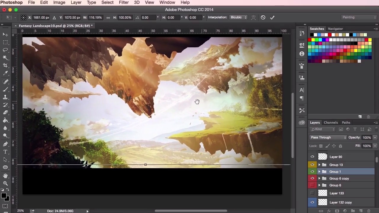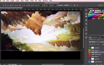 Hey guys and welcome back to the Concept Art Environment for Games course. In this video we're just gonna go through some more composition adjustments to the painting. Evaluating exactly what's worked and especially what hasn't been working, as we take it through to the final stages of its design evolution. So here at this point I'm still just playing about with the colors and the lighting. I'm not 100% happy with the composition, but I'm also not sure what I would like to change exactly, yet. So as you can see again, this video has been sped up. The painting up to this stage has taken up to most of a day's worth of work. So this is the type of thing that when you're working in production. You should be at a stage where you should be able to get something like this done within a day. So again just going through the lighting, checking the values, and changing things, tweaking things here and there. Trying different colors out, and And just having a look at the composition, zooming in and zooming out. So I'm just getting the feeling that when I'm looking at the painting, that the sense of scale and the epicness that I was going for originally in our original thumbnail painting is not quite there yet. Just checking through all the different layers and value settings that we've got here. Painting in some more clouds in Just seeing whether or not I can If I can sort of change anything. If any of these tweaks and changes that I make to the clouds here can help change the feeling of this painting It's at this point here when I start painting in class, that I realize that perhaps a more drastic change is needed to help this painting. So, throughout this entire process here I'm just It seems like I've been avoiding making this drastic change, but I'm thinking what exactly I can do to save it. What sort of compositional elements can I put in here? Perhaps there's just some cloud lines to help the composition just to give it another sense of scale. And just painting in some clouds there and seeing what how it helps, just duplicating it, stretching it. Same tricks as before when it comes to positioning these elements. So, at this point here, I'm still looking at this painting and and I'm just struggling with it, really just working through this almost artist's block of struggling with this composition. Just thinking how I can make it work and enlarging the focal point here, and just giving it a bit more space to play, and then taking things back with a soft round brush, and minimizing certain elements. At the moment it's It's feeling a little bit too crowded with all of these elements here, all of these clouds, bushes, and rocks, and landmasses. So I'm just going to take these clouds out as much as I love them when I painted them I'm just going to shrink them down, and just play about with where I can position them and how I can just give the painting a little bit more breathing space as we go along. These clouds have now merged the entire layer. I can easily move them around, and using the warp tool to give it a little bit of a curvature there to help with the composition. And just stepping back, taking a look at it again. Just seeing how these changes have helped, and what further changes need to be made to the composition of the piece. So from here now I've started to take some more drastic steps just moving the actual landmasses now and just transforming them, and turning them. Seeing what works. Just stretching them out. And just giving this focal point here on the top left a little bit more breathing space. So giving it a little bit more prominencey by enlarging it. So now that it's a little bit more room for things to breathe, but the problem we have now is all the separate elements that were very well connected before. Now look like they're just separate pieces. You've got one piece on the top left, one piece in the top right, one in the bottom left and one on the bottom right. It's just not working together as a landscape piece anymore. Just thinking of ways in how we just connect things together again. How we can just piece it all back and make it work. So, I'm just further adjusting things. Just turning things around. using the exact previous techniques that we have used of transforming and changing the size, twisting and turning using Cmd+T, and then using the eraser tool to sculpt in the shapes. Just experimenting with the background there as well. We're just trying to get it all to work. So yeah, I'm just getting rid of some of the lighting here. Just to give my eyes a fresh view of the painting. I'm just seeing what I can do and how I can tidy up some of these layers down here just to give myself a fresh start when I make some changes. So it's at this point that I've realized that I needed to extend the area of the land on the bottom right here, so that I could get a greater sense of depth and a greater sense of scale to the painting. Just going through my brush tool here, and using the Alt key on my keyboard to just use the color picker and pick out the right color for the grass. Then just exploring and extending the land mass on the bottom so that it reads well. So you can see here I'm using the transform tool here again just to, adjust the angles of the land and to see if I can get it to connect in a more natural way and just, just sort of balance it out within the composition. Here, I'm just using the same techniques as we did before at the very beginning of the course. And just using the brush tool to just feel out those shapes and just try and come out with a original and just interesting shapes for the composition. Again using the lasso tool to help me define those particular shapes. Just switching in between both of those tools, just going back and forth between the lasso tool and the brush tool. So yeah, just using that lasso tool to really increase that landmass there. And just zooming in and zooming out to check. These land masses, fixing these cliffs here as well. Just ext