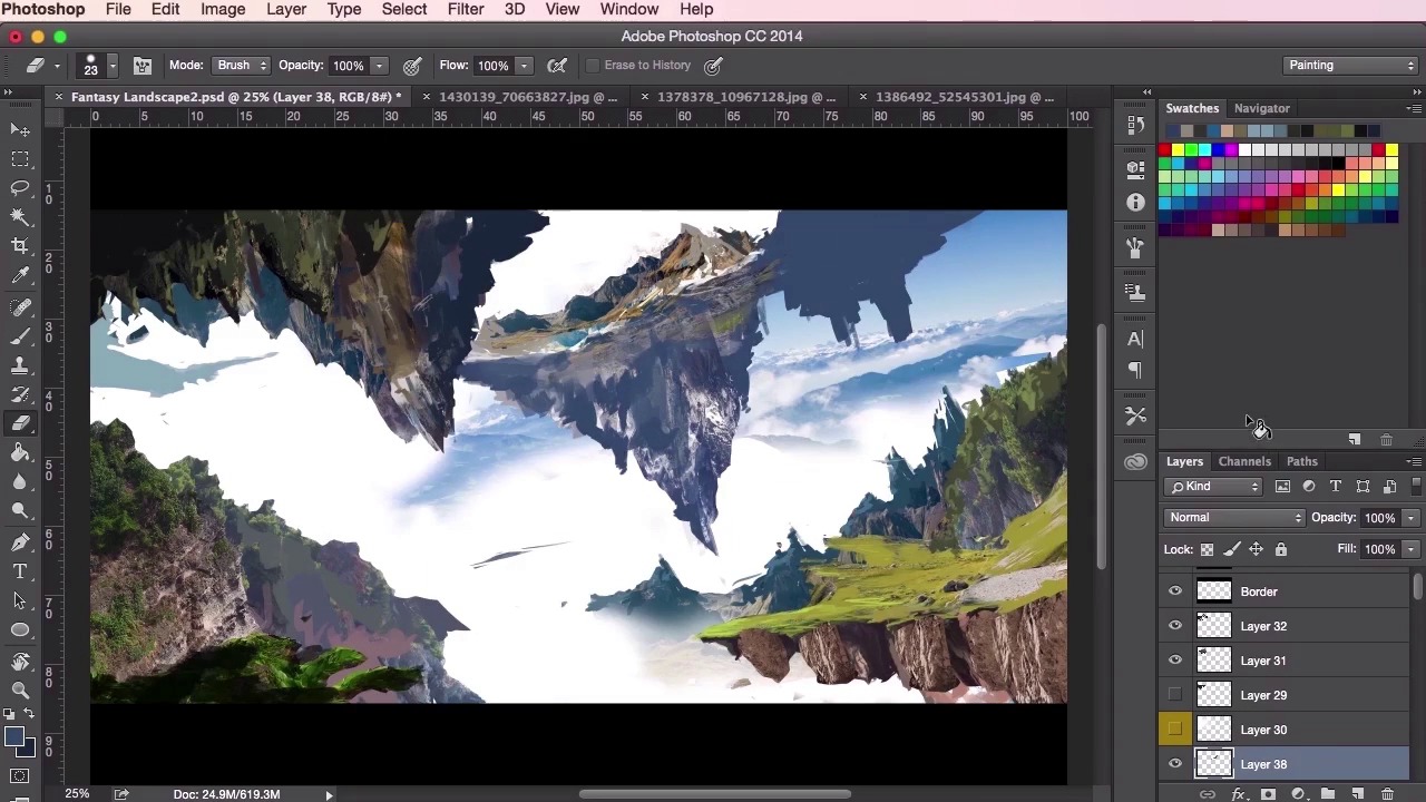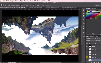 Hey guys, and welcome back to the concept art environment course for games. In this particular video, we're just going to see some major changes made to our initial thumbnail design as we continue to evolve and develop the composition and ideas of the overall painting. So the whole thing has been a pretty lengthy process and we've already gone through the majority of the techniques needed for this stage of the painting, so I'm just gonna go ahead and speed through, fast forward this video, so you can get a general idea, a general gist of what went on when making this concept painting. What I'll do, whilst we're going through the video, I’ll go through my thoughts and processes when I was developing it. So as you can see here, I'm just starting to lay the shapes and starting to really pinpoint how they should look in the painting, just getting those edges correct and removing parts which I don't need anymore. And just getting a better feel for what the painting is about and what it should look like. This video is all about putting down the details, as you've seen before, the textures and the painting, down very, very quickly. So we've gone through most of the techniques that you should be familiar with now. In order to work through this particular process so, you'll notice that when it comes to the details, I'm not too worried about making sure that every leaf is correct, or every rock is correct, or every blade of grass is correct. Like I said if this isn't a map painting, this is something which you can show your art director who can then pin it to the wall or just pass it round in the studio, and something to show the game designers and the creative directors so they can get a real, a general sense of what this particular level will look like, or what the location will feel like, and potentially what the game play will be. Just stuff like that. So here I'm just trying to increase the level of the sense of depth here by adding more structure to the floating islands and giving it a sort of halo ring effect on the top left corner here. Just experimenting with the brush tool and seeing where it goes, exactly like how we were using the thumbnails. So just, again, just always switching between the sew tool and painting and using the textures from our photographs. At the moment just concentrating on the composition here and seeing how the painting goes. I'm going to add a little bit more detail to the top mountains on the right here. Again, just using these textures to really aid us in how these mountains are going to work and how these shapes are going to work. Different sources and just experimenting again. And now these top mountains here, they're gonna be very, very close to our light source so I want to make them as light as possible, just to give it that epic feeling. Just trying to experiment with some shapes using the brush. Again just remembering to use the eraser tool as well. Just like the brushes, just set it to the setting that you're using at the time, and just use it to sculpt whatever you're painting. I'm just trying to create an interesting shape to these floating islands here. Sometimes reusing the same textures to try and get something that works. It's quite often that once you get lost in this process you forget about checking your values as well. So just keep an eye on that as well as keeping an eye on creating your structures and your details. So, just adding the values here and keeping those mountains light, just creating a sense of contrast between the top half and the bottom half of the structure here of the floating island. Just keep adding more and more depth to that bit. And you can see now how the painting has progressed since we added the thumbnail in. It might not be 100% the same as our thumbnail but the idea is still the same. It was a good starting point for us, so that's all that matters. Just going through my layers and checking if everything's correct, revisiting that structure on the left there. You'll see that sometimes I take the already painted textures and just see if I can try and use them elsewhere. Just using the transform tool to stretch and to make it into something new. Using the warp tool to manipulate the shapes into something that I want it to be. Just borrowing textures again. Switching back and forth. Still looking at the composition, still experimenting. Always keeping values in mind. It's good to use the values check layer when you can as well, just to make sure you're using the right values. Sometimes I group certain elements together, so you'll see that I'll have grouped these floating islands and color coded them, so I know what they are. And then you can sort of transform the whole group and move the whole group around. Maybe even merge the whole group together and do it that way as well. See that I'm starting to think about the composition, now just moving slightly here and there, these land masses, and seeing how they all work. So I'm not quite happy about how the top right structure is at the moment, so I'm just going to change it around and move it about. Just adding more to the bottom there, just to make it a little bit more epic. Just using the transform tool again, using the lasso tool, just painting it out, eraser tool, molding it in. Just always checking and just experimenting. At some point, you'll have to organize all your layers, like I said, as well, then. Just make sure. You'll come up with your own way of working but the way I work is I'll just assign one group to a specific path to the painting. So I'll have one group in the background for sky. I'll have another group in the foreground for the lighting, and then I'll have separate groups for different parts of the painting. Perhaps I'll have one for trees, one for leaves, one for the ground. In this case I'll have a few for the top floating islands there, and then a couple for the islands that are towards the bottom of the painting. Okay, so that's it for this video.