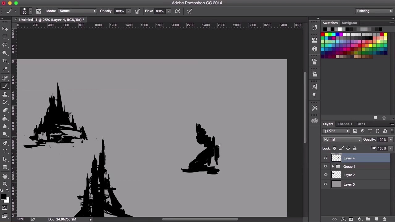 Hey guys and welcome back to the concept art tutorial. In this video I'm just gonna continue on from the previous shapes and silhouette video, so you can see here I'm just going to make another layer and choose my brush again. Just go ahead and create my second silhouette. Just feeling out the design again, using exactly the same technique as before. However, I've warmed up a little bit now, and I also have a clearer idea about what sort of theme I'm going for. So again using a mixture of broad strokes to build up the main shape and mixing it in with some smaller more delicate strokes as we did before, to give it a sense of scale by representing these sort of vines or loose wires. So you'll see here that my strokes now, compared to the previous stroke, has become a little bit more considered. However, I think it's important not to get too bogged down in the details of things. As I think that it's good to let the shape take on almost like a life of it's own and I find that the most interesting shapes are discovered that way. So you can see here, I'm starting to introduce the smaller elements to the shape. Giving it a sense of scale and just making it a little bit more interesting. But yeah, with the silhouettes, basically what it comes down to is just a lot of practice. I mentioned in the last video that the key to creating these interesting shapes was in creating as many as possible. And, by doing so, you would've generated enough shapes to get you started on visualizing your landscape. So here, I'm just gonna do the same technique as before, duplicating, transforming, and layering it on top of the previous shape, just to find out if If I can find something a little bit more interesting. This technique, I think, is a good way to get out of. Sometimes if you find yourself getting stuck, and you don't know where else to go, just duplicate the layer, or duplicate the shape, or even a part of that shape. And overlayering on top of the original shape and transforming it is a good way to come up with a fresh new view of the silhouette. So just moving it around, raising it. Again, just feeling and finding what looks good and what works. See what looks interesting and just keep going. And originally you should use the initial shape, transforming it. The key here is to just experiment and like I said before, just not get too precious with your creations and limiting yourself to other potential possibilities. Trying to make the shape really dynamic, and as interesting as possible. So just grouping that layer and putting it aside, and let's move on to the next one. You can see here now that again, I'm using the crop tool on the left to enlarge the working area of the canvas. Just making it bigger, then just make sure that you accept it. Crop the image. And then just go back into the background layer and then just filling it in the same color again. In the next thumbnail, let's go ahead and choose our brush. Sometimes I try to work in different ways to keep things as fresh as possible. If you find that in my last silhouette I think I was a little bit too careful, oh, with my mark making and things were a little bit too considered. So in this one I just wanna try and switch it up a little bit and make this next thumbnail a little bit crazy and random, just to liven things up a little bit. So I have a real mix of silhouettes to choose from when creating my environment fundamentals later. So you can see my strokes are a little bit more dynamic, a little bit faster in my mark making. So apart from that, still using the same techniques as I did in the previous two, just a different way of working. So here you can see I used the marquee tool again, copying and pasting, transforming, and really just to let the shape take on a life of its own. And trying to be as random as possible. Trying to find something really interesting within the composition. Something that I may not have found If I was doing it carefully as I did before. So with this on,, I'm just rotating. Really seeing what's going on, copying and pasting elements, transforming bits and bobs. And seeing, varying the size, and getting them to tie in together in some way. So, yeah, just very random. Merging the layers. I'm just gonna work into it, now. Remembering thick versus thin, contrasting shapes. I'm thinking now that in the previous two shapes, looking at them now, they were a little bit too symmetrical. So I'm thinking now of trying to make this one a little less symmetrical and a bit more dynamic. So coming down here, creating a few sort of leg like structures Just using the brush again, just to feel the edge. Just to grow it. And let the shape dictate how it wants to look. So again, just broad strokes, molding your 2D clay and just trying things out. So you can do the same thing with your razor as you do with your brush as well. Just varying the size of your razor can also change the look of your silhouette so you can see I'm putting in smaller eraser lines, and now I'm putting in some smaller lines here to compliment it. Giving it a sense of scale again. Still not quite sure what this is about yet, so what I'm going to do is I'm going to use the previous shapes to aid the design of this one. So I'm just grabbing an element of the previous thumbnail, just overlaying it on top again. Transforming it, turning it and seeing what I can come up with by overlaying it on top of the new shape. So I'm gonna grab the shape from the first thumbnail, too, and just keep exploring options, experimenting, keeping things interesting. And yeah, just do exactly the same with all your other thumbnails. I would aim to begin with about seven to ten thumbnails is a good number to start and to choose from. And from there we'll go into our landscape paintings. So, yeah, there you have it, just keep exploring and creating shapes until you are happy with the amount you have created. And then in the next video I'll show you how we're going to use these shapes to cre