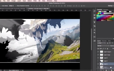 Hey guys. And welcome back to the concept art and environment course for games. In this lesson we're gonna go through the initial painting stage whilst continuing to adjust and to tweak the design using our photographic textures as we go along. So once you've accumulated a large enough library of brushes that you found online, just start experimenting with them. Experimenting with them all until you find one which you really like the look of and you really like for laying down just initial color. There are plenty of brushes out there, including some from Photoshop's own library, which are good for this and have sort of very subtle texture and blending settings included in them to aid you when you start blending in certain colors in the painting. So here you can see that I've color picked the blue from this photograph and I'm using it here to just subtlety reshape and remold this mountain into something that's a little bit more interesting. Still keeping the composition very, very loose. So you can see that I'm just adding in more shapes as well. Again, to color pick off of the photograph, all you have to do is just, whilst having the brush tool selected, just hold the Alt key on your keyboard, and then your cursor will turn into the color picker. And then just pick and click select what sort of color you've got on your canvas and the color will change. This is a very easy way to paint at this stage. Just sort of using the canvas with the colors that are already there as your color. So here you can see I've sort of color picked the white or the grey, the light grey of the mountain. Just doing some subtle lighting. Just fitting it in. So, this stage is all about just using the brush, and basically experimenting with it. Again, using the color picker tool, and taking colors from the photograph, and just developing the shapes further. Changing the size of the brush, changing the strokes and directions, just general loose mark making. Adding in some details just using the smaller brush and just filling it in with the bigger brush. So again, just using that color picker, we're gonna try and suggest some mountains and structures on top of this land mass. Zooming out to see how it looks like so far. And just continuing with the painting. Again, it's always a good idea at this stage to keep in mind where your light source is coming from. That should dictate how you lay out your photographic textures, as well as them having there own sort of lighting. And just keeping in mind how you place them on the canvas and how it works with your composition. So as you can see in this painting, I'm thinking that the light should still be coming from the top left of the painting. So I've tried to lay out these photographic images so that they follow the same light source of the overall painting. So again, just using the exact same techniques as we did in the previous video. I kind of like these far away mountain shapes here in the distance. It really adds that epic sense of epicness and scale to it. So I want to try and utilize that in the background somehow. So I'm just erasing using the soft eraser brush to erase out the bits that I don't want. And then just using the transform tool to stretch it out and try and utilize the whole area. Really helps give us that sort of epic horizon in the distance as well, which is kind of cool, so I'll just keep it there for now. Use it to dictate the rest of the background, hopefully. It's got a few clouds in there as well which we'll go into and develop at a later stage. So yeah, just using the eraser tool again to sort of construct, to deconstruct and then mold these photographic elements. You don't necessarily have to follow exactly what the structures in the photographs are, you mainly want to use it for some of their information but mainly their textures and color. So I'm just gonna take away bits that I don't think I need and you can always use your brush tool again to reformat, to put some land mass back into it. So, yeah, just thinking about the initial rock structures like this and what sort of shapes will look interesting. Using the eraser tool, like I said, to cut into it and to see if I can come up with anything that looks more interesting, or just some sort of happy accidents sometimes. So, yeah, using the brush tool again to start painting over it. Erasing bits that you don't want like these white bits on the right here. I'm not so sure about them so I'm just going to paint some grass on top using the color picker again. Create some land, some structure. Sometimes the natural structure in the photographs can help you with this and help dictate how you should paint the land, and how you should paint the rocks, and the structures. Try and follow what's on the photograph as well, if you can. So yeah, just again, using the transform tool. Ctrl+T or Cmd+T, just to adjust the shapes and the placements of structures, you know, just play about and move it around, to see how it fits best within the overall composition. And with the lasso tool, you just wanna roughly cut away shapes that you want to use from your reference photographs. This isn't a map painting, so there's no need to be 100% accurate, right? When cropping your photographs at this stage. So all we want to do now is just get an initial feel for the painting, using the colors and textures to experiment with the design and the layout. And then again, just switching back and forth between tweaking the textures and the shapes. With using the brush tool to paint and then the lasso tool to create shapes. Just playing around and to see what sort of ideas develop, always keeping the shapes and how these interesting things in the forefront of your mind. So yeah, that's it for this video. In the next video, we're gonna go through into further detail on adding more textures into your painting, while showing you how to check your values using a values check layer. See you there.