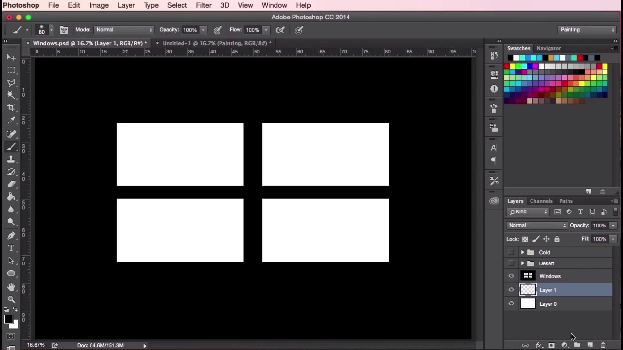 Hey guys and welcome back to the concept art tutorial for games. In this video, we're going to go through a quick way to start setting up your file for thumbnails and to start placing your composition ideas down quickly. So, the first thing we're going to do is we're going to go to File > Create a new document, so International Paper, A3 is fine. Just click OK. Now go to Image, we want to rotate the canvas, so go to Image Rotation > 90 degrees Clockwise, zoom in a little bit. And I'm just going to use the crop tool here. On the left, we're just going to widen it a little bit so that it fits the whole screen. Click Crop. I'm gonna fill it with white. And let's name this layer Background. Okay, once that's done, create a new layer. We want to fill this layer with black. And from there we're going to select marquee tool by clicking here, making sure it's the rectangular marquee tool. And then we're going to drag out some shapes, which will be the areas your thumbnail ideas will go in. So, to create the second or more shapes, you just hold the Shift key when you're dragging these shapes. And then once you're happy with the placement, make sure you're in the black layer and then just hit the Delete key to create these holes or view finder windows. Let's call this layer Windows. So once you've done that, what you should do next is hit the lock key so you can lock the layer. Which means you can't modify any further. So if I had this layer selected and I tried to paint here, it simply wouldn't work. But if I was to create a layer below, let's call it painting, then it will work just fine. So now we have a nice little window here, which gives us some borders for our thumbnail composition. The next step is to go ahead and show you how we come up with the ideas for starting your thumbnail paintings. So, the best way I find is to literally just surround yourself with the ideas and reference images that would help inspire what you're trying to go for. So, what I usually do is just go out and find these images and then just save them into a folder. And then just copy and paste them or drag and drop them into Photoshop. So you'll see that I've got a folder of stock images here, which I just click, drag and drop. Resize them down so they fit into my working area. I'm making sure that the images on top of the windows there, otherwise you won't be able to see them, like so. Then just placing them around the canvas, so that they're constantly in your field of vision when you're creating your thumbnail ideas. So, ideally, the type of images that you'd want to surround yourself with should ideally be the type of images that you want to create the same or similar feeling for the painting that you've got in mind. So here, you can see I've got a whole folder of grassy mountain type, rocky landscape reference images which I'll just place around here. It'll help inspire you, the composition and the type of shapes that you want to create for your thumbnails. So once you've got them all arranged like so highlight all of the pictures, hit Ctrl+G or Cmd+G to group them up. And let's call this group Mountains. So here you can see that I've got some other folders here as well. I've got a cold landscape folder here to inspire my cold thumbnails. And I've got a desert landscape here to inspire my desert style of thumbnail ideas. So doing your research like this is a good way to get started with the ideas process, especially if you don't have anything specific planned. It's good to take into account the color palette, the mood, perspective, to help create some interesting and unique paintings. So that's it for setting up the file to create your thumbnail paintings. In the next video we'll go through on how to create some value studies using this setup. And we'll also start thinking about bringing some of those shapes in that we created from the previous videos. See you there.