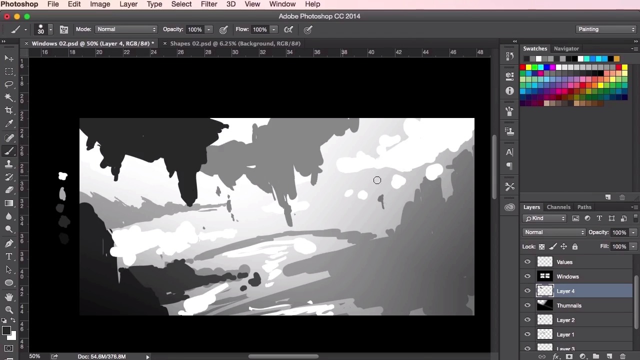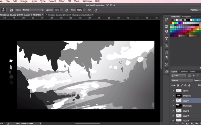 Hey guys, and welcome back to the concept art tutorial. In this video we're gonna go through creating our value studies, and also bring into practice what we've learned in the previous lessons to create three or four thumbnails based on the reference. Now, what's important here in this setup are the swatches on the left hand side. Basically what I've done is to create five different shades of gray, ranging from white, and then progressively getting darker to black, or very dark gray. And now, what they're gonna help with is our values. To start out, we'll use these swatches to color pick off and then just basically create a sense of depth to our thumbnails. So I'm gonna use the gradient tool, here, just to add a bit of background to paint off, and then once we've done that, lower the opacity down so it's not too dark. We'll just use our brush tool on another layer, set the hardness to 100% and start painting. So to color pick the swatches, just hold down the Alt key whilst you have the brush source selected, and then click on the color you want. Now, as a general rule, light values recede, and dark values come forward. So basically, the closer something is, the darker it should appear, and the further something away is, the lighter it should appear. So for this painting I've been looking at grassy mountain range references. So I've been thinking of creating a somewhat fancy piece that reflects something along those lines. And just to start off with, I'm using the midrange grey color here just to place down some of the ground work, and just roughly place some shapes. I'm thinking about the elements of the landscape. So I've got some rocky elements on the left and the right here, just creating some sort of cliffs or mountains. I'm thinking really early on about the composition and how and what will make it interesting. So just using the color picker here to add some more darker values to the foreground. Increasing the brush size. Just again, feeling some shapes, and thinking about what makes the painting look interesting. You can also use the eraser tool, setting the same brush setting as your brush tool, and use it to sculpt out, and just sort of chip away at your shapes and see if you can come up with any happy accidents or anything that looks cool. Just chipping away at them here, switching both between the brush tool and the eraser tool, and just feeling out what the composition looks like. You can also use the lasso tool to make shapes or as I've done here just sort of separate the layers so you can move them around and Just experiment with placement of the composition. So, yeah, just picking up a lighter value, here, just to add some more details. Again, just feeling the painting out, sculpting it with your razor. So, now I'm just gonna change the shape dynamics of the brush, so that it allows my brush tool to act with my work on pen, so that the pen pressure adds sort of variety to the strokes that I'm making. So now I can sort of add a little bit more details, and smaller brush strokes. So these small details, as I mentioned before, will add a sense of scale to the painting. And I really want to try and get a really fantasy, kind of epic, feel to this. Just by doing this and adding some extra little small marks and structures, we can begin to do that. So with these thumbnails, again, I'm using the hard round brush which was introduced at the beginning of the course. No extra settings, apart from the pen pressure, as you saw before. No textures are needed or anything like that. We just want to keep these thumbnails as simple and as easy to read as possible in these early stages, which really forces us to focus and slap down just flat color and focus on making these interesting shapes. So over here now, I'm sort of playing about with what could potentially be my focal point. Sort of a floating island. I'm thinking about what sort of structures we can create using this floating island idea, and what sort of structures would be underneath the island. Perhaps we could have a almost upside down land structures to represent how the earth is sort of been ripped out from underneath it So what I'm doing now is just adding some more darker foreground shapes. I want this to really pop forward, which will help sell the sense of scale to the structures in the background. And you can see here, now that we've got different values, the sense of depth is really starting to pop through. So just using the white color here, just to represent, perhaps, a river flowing in the background there, a couple of waterfalls, perhaps. It doesn't have to be too detailed at this point. I just want to, it's just information that I can understand and that I can read and then as we move on to the painting we can develop these ideas and really add some detail to it. So, again, just using the brush tool, a smaller brush size to add that sense of scale. You can see I'm using quite a few layers here as well. So now I'm just moving on to the air brush tool, so this soft round brush, and what this does is it adds a bit of lighting to this scene and a sense of atmosphere. So just blocking out the structures with the lasso tool and using the soft round brush, I can add some atmosphere, and also, it adds an extra sense of depth as well. Remember, structures behind you, behind, in the background should appear lighter than the structures in the foreground, so that contrast really helps to sell that. Right now I'm thinking about how the lighting should work in the piece, and perhaps we should, using the soft round brush, just painting in some light rays from the top left over there. Again, just information that I can use when I take it onto the main painting. Okay, so now we are moving on to the shapes that we created before. You can see how I've got a few more shapes that I've created, and just dragging and dropping them into the painting using the Transform tool, which is Ctrl+T or Command+T to just move it around, duplicating 