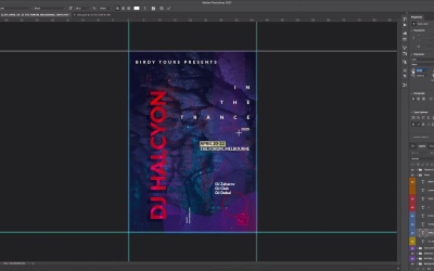 Okay, welcome back to this course on creating an event poster design in Photoshop. In the last video, we found an event poster design template on envato elements. We inserted content, we downloaded and added a new font, and we refined the structure of the design. Now in this video, we're going to be adding a logo stock photography, and we'll change the color before we apply some last minute refinements and export the poster. We begin this lesson in envato elements yet again, as I mentioned earlier, envato elements is a subscription to over 53 million creative assets. So far, we've used a poster design template, a fond from envato elements, and now we're going to look for a logo to add to the mix. Envato elements has over 15,000 logo designs to choose from, they're all high quality, and many of them are vector designs that are customizable. Now, I've picked this one called Bird Colorful Gradient, I've really liked the bird logo here and I think it could work quite well for our Birdy Tours Presents section of the poster. So, let's download it. We'll look for it in our downloads section, unzip the file, open the folder, and we're going to open the Adobe Illustrator file. We'll pop into Illustrator just briefly, so don't panic, and the only reason we're in Illustrator is actually just to grab this logo, because it's part of the way it comes, it's part of this bigger design. So, we just need to grab that bird, now we're gonna just open a new in Illustrator, a new 1440 pixels by 1440 pixels just cuz it's a nice easy big size. And cuz it's a vector design, we can just grab it and resize it, and there won't be any pixelation or anything like that because it's a vector. And all we need to do is just save that, so Command and save or go File and Save. Pop that in our minimal poster design folder and I'll just name it Birdy logo. And you just need to save it as an Illustrator file, you don't need to export it as anything else. We'll pop back into Photoshop and I'm just going to grab that file out of the folder, I'm just gonna drag it into Photoshop. Yep, that's fine, and there you go, it's a bit effective because it's behind a texture overlay at the moment. So don't stress about that, but just gonna resize that and pop that sort of next to Birdy Tours up here, we'll clean that up, right now actually. So, that's your Birdy logo, that's a Birdy Tours Presents text, we're going to also make a group, and we'll rename that Birdy Tours. Let's drop that down and we're just going to nudge the text part of Birdy Tours over. So that's like that, kinda looks nice next to the logo. And we're just going to select the shape of the logo, Command and click, and just central line Birdy Tours Presets, yep, it's all pretty centered. Now, the reason we put this in a group is because we're also going to center this group. So we're just going to grab that background layer, select that, hit Command, select Birdy Tours, and see those line tools that pop up, aligned to the center, there you go, that's all, that's all you need to do. So, now we've got our Presents logo up the top, nice and centered, we've got our hero text here, and we've got all of our supplementary text over here. The next thing I wanna do is insert a photo, at the moment we've got just some sort of texture at the back here, and that's cool. But I think that we can take advantage of this button and really communicate what kind of event this is by adding a stock photo to it, so for that, we head back to envato elements. So, envato elements has nearly 2 million royalty-free stock photos to choose from, all of them are high quality and cover a diverse range of genres and activities. And elements also gives you access to more than 50 million photos on 2020. I've selected this photo from Pressmaster that I really like, I love the colors of it, and I like that she's a DJ, so this is what's happening in our event, this is what we want. So I'm going to download that. And let's open that up in our Downloads folder and just drag it into Photoshop file. I will just resize it, just so it fits the canvas. Looking good, and it's already in the background there. So, as you can see, this new photo it's positioned really well, I mean, she's poking sort of out really nicely between the different streams of information that we have here. But the color of the photo is obviously making most of this text quite difficult to read, so it's time to start refining our design a little bit and making some color choices. So the first big problem I am seeing, obviously, and you will be seeing it as well, is the DJ housing on text is basically unreadable, it's camouflaging into background basically. So, we're gonna go in and try and mess with the effects a little bit, so if we go into text effect here, I can say that there's an inner shadow on there, okay? That's removed and this so drop shadow, we might leave that on cuz we might need that later, in fact, let's take it off and we can always put it back on. I was just gonna do a quick color overlay, which we'll just turn into a different color, there we go. So, now we can actually read it, it's just in white, if we want we can add a drop shadow to it later on, but let's just leave that the way it is for now. We've also got this blurred section here, which I'm not loving right now because it's just adding a bit of a mess and it's sort of out of alignment with this text, so that looks better. So I've just actually aligned it sort of vertical center by selecting the DJ Halcyon shape like the text, and aligning that DMT blurred to the center of it. That looks a bit better now because it looks like kind of streaks of the letters, now I may even just going to cover that white as well and just play with the opacity, see I think that's looking quite good. Cuz I still like the effect but we just need to soften it a little bit, we'll leave it at that for now, we might even go all the way down to 10, okay? Now, you can also see in the background, 